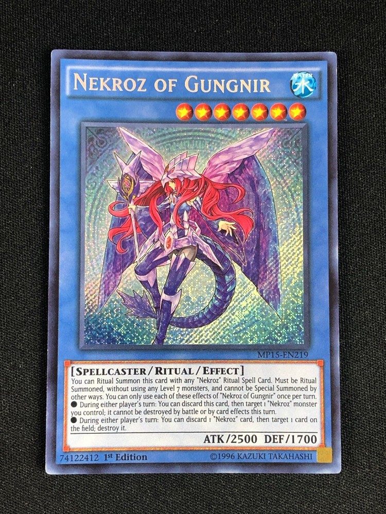 YUGIOH NEKROZ OF GUNGNIR MP15-EN219 1ST SECRET ALL CARDS IN THIS AUCTION ARE IN NEAR MINT TO MINT CONDITION UNLESS STATED OTHERWISE IN THE TITLE. AND, YOU ARE GUARANTEED TO RECEIVE THE CARD NAMED IN THE TITLE. PLEASE NOTE, IF THERE'S MORE THAN 1 COPY AVAILABLE, YOU MAY NOT RECIEVE THE SAME EXACT CARD IN THE PHOTO. HOWEVER, IT WILL BE THE SAME EXACT CARD IN THE TITLE, AND DESCRIPTION! PLEASE CONTACT ME IF THERE IS ANYTHING WRONG WITH YOUR ORDER OR SHIPPING BEFORE LEAVING FEEDBACK. PLEASE GIVE ME A CHANCE TO FIX ANY PROBLEM YOU MAY HAVE. THANK YOU! Shipping Information: Shipping and Handling for this auction will be Free inside the United States - With Tracking! International Shipping Available Through Ebay’s Global Shipping Program. (BUYER IS RESPONSIBLE FOR ANY TAX) **Read the TITLE to see the condition of the cards Before you place a bid. Any damaged cards will be listed as such In The Title (FOR EXAMPLE: Blue Eyes White Dragon LOB-001 - Play/Edgewear). If it doesn't say anything about damage, it is in near-mint to mint condition. If you have any questions, message me Before you place your bid.** RETURN POLICY: RETURNS ARE ACCEPTED IF THE ITEM ARRIVES DAMAGED, OR NOT AS DESCRIBED. RETURNS ARE NOT ACCEPTED FOR BUYERS REMORSE. CHECK OUT MY OTHER AUCTIONS! _gsrx_vers_1516 (GS 9.3 (1516))