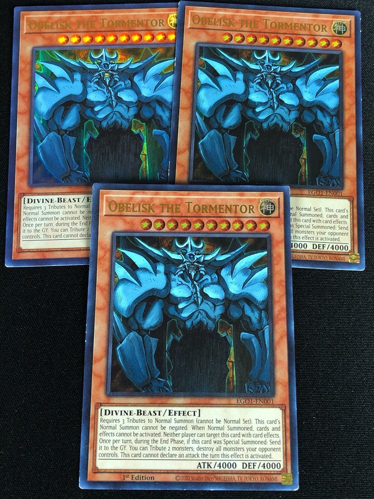 Absolutely thrilled with these Obelisk cards! They arrived in perfect mint condition, just as described. Seller was super responsive and made sure everything was perfect. Definitely recommend this seller for any Yu-Gi-Oh! collector!