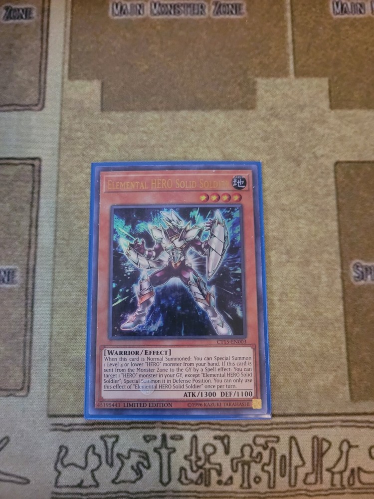 YUGIOH TCG ELEMENTAL HERO SOLID SOLDIER CT15-EN003 ULTRA LIMITED EDITION NEAR MINT YOU GET WHATS SHOWN IN THE PICTURE AND DESCRIPTION ALL CARDS ARE SHIP WITH PROECTIONS. ALL CARDS THAT IS BELOW 20$ WELL BE SHIP IN PWE WITH EBAY TRACKING. 24$-21$ CARDS WELL BE WITH STAMPS PWE. CARDS ABOVE 25$ WELL BE SHIP IN BUBBLE MAIL WITH USPS GROUND SHIPPING TRACKING. IF YOUR ORDERS ADDS UP TO 25$ OR ABOVE IT WOULD BE ALSO IN A BUBBLE MAILER. IF YOU ARE FROM PUERTO RICO AND ARE BUYING MAKE SURE YOU HAVE "COUNTRY LIST AS UNITED STATES NOT PRI" OR ELSE I CAN'T PRINT EBAYSHIPPING LABEL WITH TRACKING AND WELL SENT ITEM BY STAMPS TO YOU. THANKS. To international buyers since I have been having many buyers that are using Fright Forward Services. YOU ARE BUYING AT YOUR OWN RISK. As I list in my description, I ship using PWE (Plain White Envelope) for cards that does not reach $25 and above. I do not know how the Fright Services pack it after mailing it to them. All I know is that many of the PWE does not make it to its original destination (your real home address) either it's the Fright Services fault for not packing it in bubble mailer or Usps for losing it in transit. If it is being send by PWE by the Fright Services, it made take months before getting there. Also, in case if its lost or does not make it to its destination you must direct your attention to the Fright Services before contacting me. It is not my responsibly for lost mail(item) due to 3rd party delivery. To make sure you get your cards to you faster and more accuracy you must order cards combining to $25 or above that way I can use Ground Advantage and send it in bubble mailer most of the bubble mailer I use will make it to its destination. Thank you. IF YOU CAN LEAVE FEEDBACKS THAT WOULD BE MUCH APPRECIATE THANK YOU FOR BUYING.