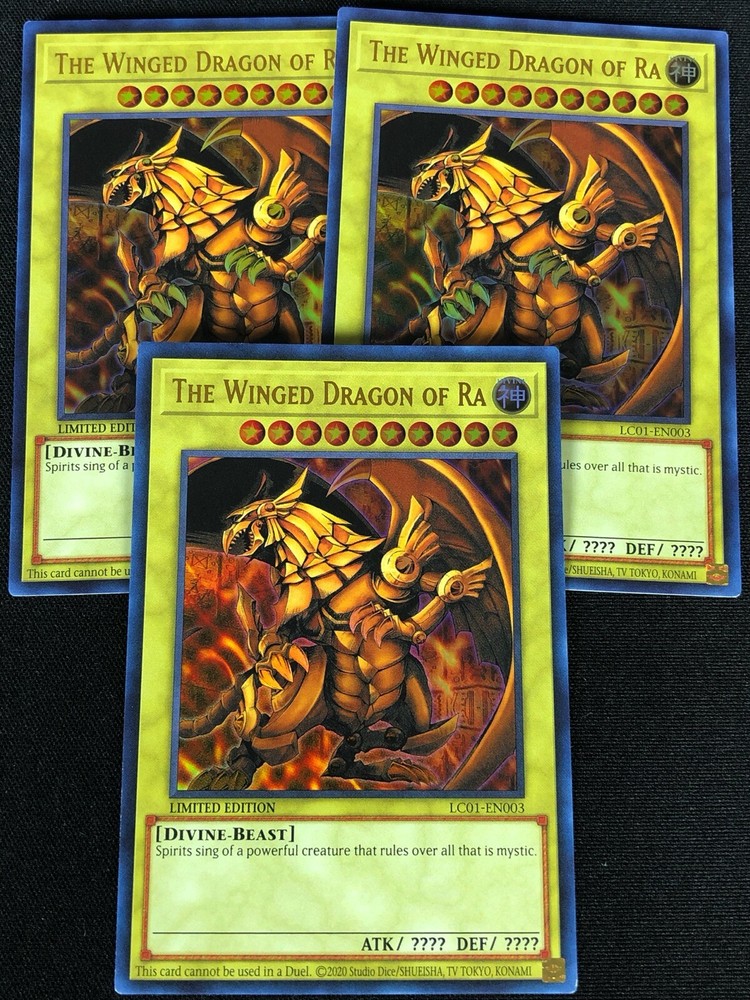 YUGIOH THE WINGED DRAGON OF RA LC01-EN003 ULTRA X3 (NM) ALL CARDS IN THIS AUCTION ARE IN NEAR MINT TO MINT CONDITION UNLESS STATED OTHERWISE IN THE TITLE. AND, YOU ARE GUARANTEED TO RECEIVE THE CARD NAMED IN THE TITLE. PLEASE NOTE, IF THERE'S MORE THAN 1 COPY AVAILABLE, YOU MAY NOT RECIEVE THE SAME EXACT CARD IN THE PHOTO. HOWEVER, IT WILL BE THE SAME EXACT CARD IN THE TITLE, AND DESCRIPTION! PLEASE CONTACT ME IF THERE IS ANYTHING WRONG WITH YOUR ORDER OR SHIPPING BEFORE LEAVING FEEDBACK. PLEASE GIVE ME A CHANCE TO FIX ANY PROBLEM YOU MAY HAVE. THANK YOU! Shipping Information: Shipping and Handling for this auction will be Free inside the United States - With Tracking! International Shipping Available Through Ebay’s Global Shipping Program. (BUYER IS RESPONSIBLE FOR ANY TAX) **Read the TITLE to see the condition of the cards Before you place a bid. Any damaged cards will be listed as such In The Title (FOR EXAMPLE: Blue Eyes White Dragon LOB-001 (HP) If it doesn't say anything about damage, it is in near-mint to mint condition. If you have any questions, message me Before you place your bid.** *PLEASE READ* Ebay's Card Condition Guidelines: (NM) = Near mint or better Comparable to a fresh pack Flaws may include Minor corner and edge wear (LP) = Lightly played (Excellent) Has clearly visible signs of wear Flaws may include Moderate edge chipping Moderate surface scuffing Fuzzy corners (MP) = Moderately played (Very good) Has moderate-to-heavy damage all over Flaws may include Moderate discoloration Moderate creasing Moderate to heavy edge chipping Rounding and soft corner (HP) = Heavily played (Poor) Is extremely worn and displays flaws all over Heavily Played condition cards exhibit signs of heavy wear. Heavily Played condition cards may include cards that have significant creasing, folding, severe water damage, heavy whitening, heavy border wear, and/or tearing. RETURN POLICY: RETURNS ARE ACCEPTED IF THE ITEM ARRIVES DAMAGED, OR NOT AS DESCRIBED. RETURNS ARE NOT ACCEPTED FOR BUYERS REMORSE. CHECK OUT MY OTHER AUCTIONS! _gsrx_vers_1680 (GS 9.8.3 (1680))