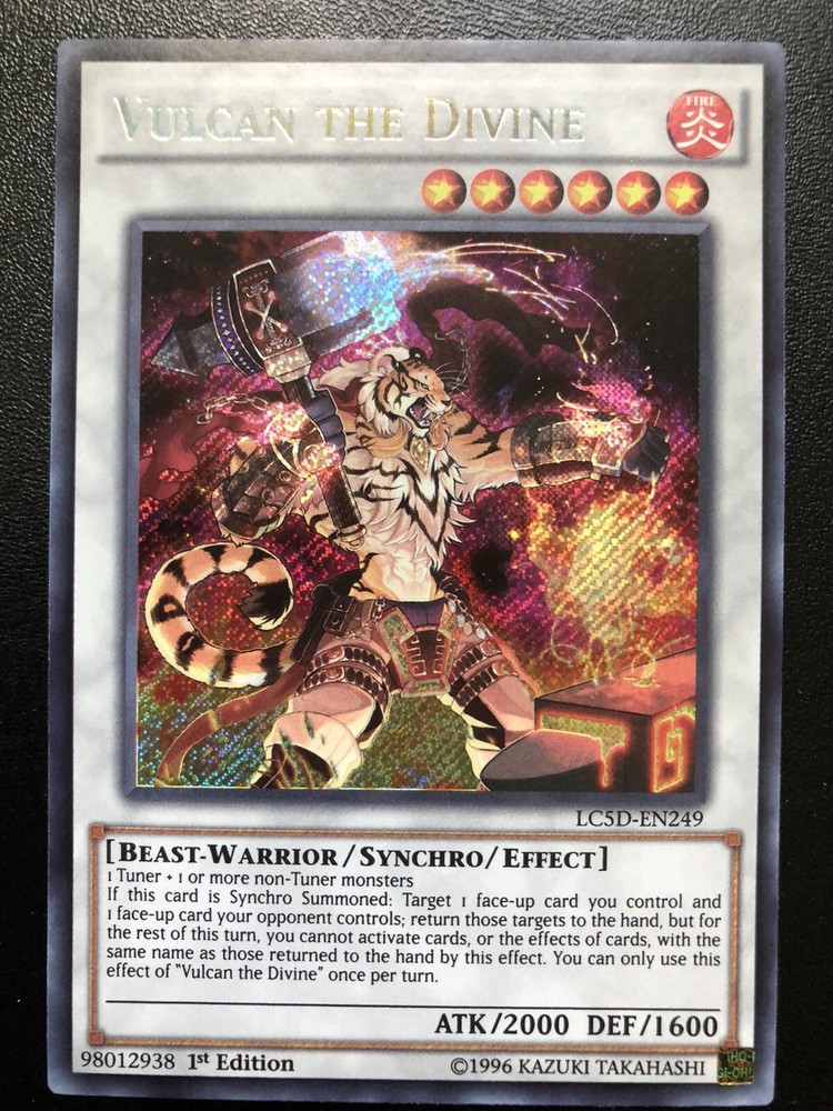 YUGIOH VULCAN THE DIVINE LC5D-EN249 1ST SECRET (NM) ALL CARDS IN THIS AUCTION ARE IN NEAR MINT TO MINT CONDITION UNLESS STATED OTHERWISE IN THE TITLE. AND, YOU ARE GUARANTEED TO RECEIVE THE CARD NAMED IN THE TITLE. PLEASE NOTE, IF THERE'S MORE THAN 1 COPY AVAILABLE, YOU MAY NOT RECIEVE THE SAME EXACT CARD IN THE PHOTO. HOWEVER, IT WILL BE THE SAME EXACT CARD IN THE TITLE, AND DESCRIPTION! PLEASE CONTACT ME IF THERE IS ANYTHING WRONG WITH YOUR ORDER OR SHIPPING BEFORE LEAVING FEEDBACK. PLEASE GIVE ME A CHANCE TO FIX ANY PROBLEM YOU MAY HAVE. THANK YOU! Shipping Information: Shipping and Handling for this auction will be Free inside the United States - With Tracking! International Shipping Available Through Ebay’s Global Shipping Program. (BUYER IS RESPONSIBLE FOR ANY TAX) **Read the TITLE to see the condition of the cards Before you place a bid. Any damaged cards will be listed as such In The Title (FOR EXAMPLE: Blue Eyes White Dragon LOB-001 (HP) If it doesn't say anything about damage, it is in near-mint to mint condition. If you have any questions, message me Before you place your bid.** *PLEASE READ* Ebay's Card Condition Guidelines: (NM) = Near mint or better Comparable to a fresh pack Flaws may include Minor corner and edge wear (LP) = Lightly played (Excellent) Has clearly visible signs of wear Flaws may include Moderate edge chipping Moderate surface scuffing Fuzzy corners (MP) = Moderately played (Very good) Has moderate-to-heavy damage all over Flaws may include Moderate discoloration Moderate creasing Moderate to heavy edge chipping Rounding and soft corner (HP) = Heavily played (Poor) Is extremely worn and displays flaws all over Heavily Played condition cards exhibit signs of heavy wear. Heavily Played condition cards may include cards that have significant creasing, folding, severe water damage, heavy whitening, heavy border wear, and/or tearing. RETURN POLICY: RETURNS ARE ACCEPTED IF THE ITEM ARRIVES DAMAGED, OR NOT AS DESCRIBED. RETURNS ARE NOT ACCEPTED FOR BUYERS REMORSE. CHECK OUT MY OTHER AUCTIONS! _gsrx_vers_1680 (GS 9.8.3 (1680))