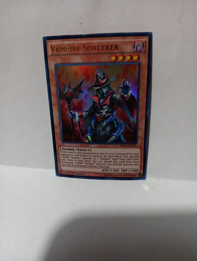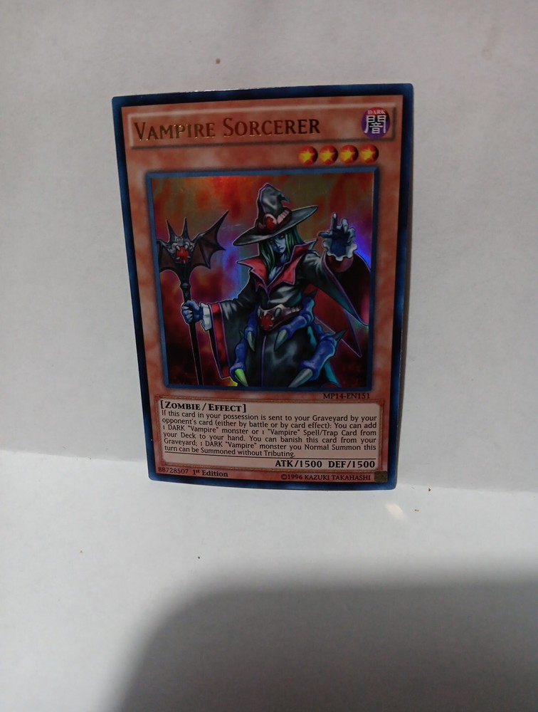 This ultra rare 1st edition Vampire Sorcerer card is a must-have for any Yu-Gi-Oh! TCG collector. With a dark color scheme and a holo finish, this Japanese-sized card features a powerful Zombie creature with 1500 attack and 1500 defense/toughness. Perfect for fans of the game, this card comes from the 2014 Mega-Tins Mega Pack set and has been lightly played (Excellent) condition, making it a great addition to any collection. The card also comes ungraded and is in English language. Don't miss out on the chance to add this stunning card to your collection!