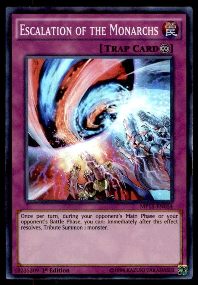 About Me Other Listings Feedback Add to Favorites Contact Me Bluenose Yu-Gi-Oh! 1st Edition Escalation Of The Monarchs #MP15-EN054 Near Mint No stock photo / These are real scans or pictures Details Description: Escalation Of The Monarchs Category: Yugioh Year: 1996 Product: Yu-Gi-Oh! Set: 1st Edition Card Number: MP15-EN054 Special: Near Mint Dimensions: 3¼" x 2¼" SKU: YU B0002 R02 N (23) Payment Payment for buy it now is required immediately and for auctions it must be paid within 72 hours. Shipping Shipments usually make their way out in 3 business days. All orders to USA under 800$ USD typically are NOT subject to import or duty! We also offer free shipping on all our cards for north america. Returns and Claims Please view listing photo and description prior to purchase of card to make sure the card and condition is right for you! About Us Please keep in mind the following conditions .-------------------------------------------Near Mint: a card that shows very little to no signs of ware or usage such as very little whiting. -------------------------------------------Light Play: A card that shows signs of ware such as but not limited to whiting, slight bend or scratches. -------------------------------------------Heavy Play: A card that shows signs of ware, whiting, bending, creasing, folding or other various issues.-------------------------------------------Damaged: a card in very bad condition can have some or all of the above mentioned condition notes including peeling, stains, writing, etc.-------------------------------------------The photo in ads are the EXACT card you will recieve. Listing By Kronocard trading cards software v2.7.0.1