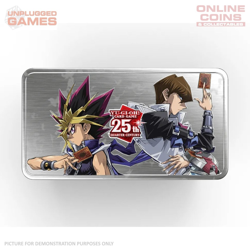 Dueling's 25th Anniversary hits its stride with this year's Tin: the 25th Anniversary Tin: Dueling Mirrors! Mirrored back-to-back, Yami Yugi and Seto Kaiba stand like giants over a series of iconic monsters from the Yu-Gi-Oh! anime serie;'s. While they're the world's greatest Duelists, Yugi and Kaiba have always been mirrors of each other, Yugi relying on the Unity of his team and the power of friendship, Kaiba taking Pride in his own, nearly unmatched skills. As always, each Tin will contain 3 Mega-Packs, each with multiple rarities guaranteed. This year's Tin does away with some of the lower rarity slots to give everyone more of the higher rarity people are looking for, including a Quarter Century Secret Rare in each of the three packs! Take pride in your pulls, since we've united them together into the higher rarities! This year's "best of" Tin picks pull together popular and sought-after cards from a dozen recent booster sets, including Power of the Elements, Photon Hypernova, Cyberstorm Access, Duelist Nexus, Age of Overlord, Maze of Memories, Amazing Defenders, Wild Survivors, and more! Plus, brand-new art versions of some of Dueling's most famous cards, from Red-Eyes Black Dragon and Dark Magician Girl to Harpie's Feather Duster and Raigeki. With 400 cards in the set, this Tin doesn't just have something for everyone, it's got a whole lot of somethings! Meanwhile, the 50 Quarter Century Secret Rare cards in the set are a trip down memory lane, showcasing iconic monsters and imagery from decades of Dueling. In addition to the sixteen cards shown on the sides of the tins (and more about those later!), there were just too many famous moments to pass up, so we added 34 more cards to the Quarter Century Secret Rare pool, and you'll get three in every Tin. Total per Tin: 3 Quarter Century Secret Rares 3 Prismatic Secret Rares 9 Ultra Rares 24 Commons
