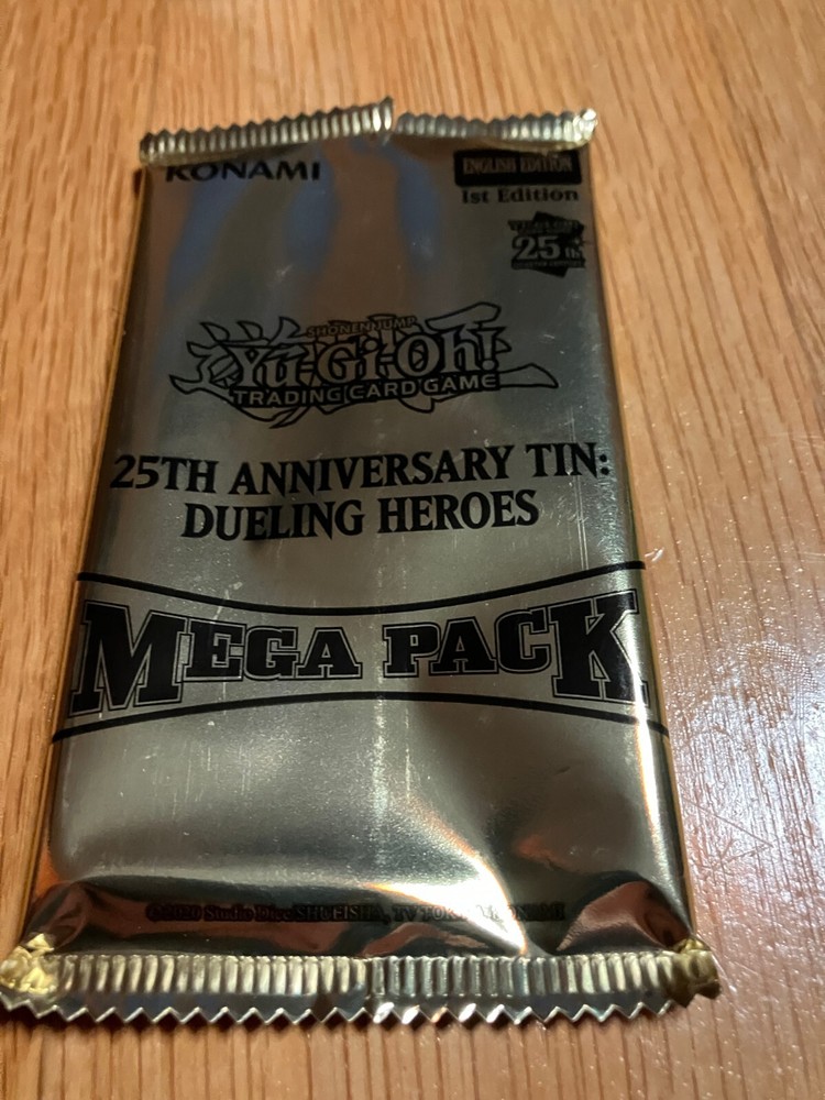 YuGiOh! 25th Anniversary Tin Dueling Heroes Mega Pack - 1st Edition - EMPTY PACK Each pack has been excellently preserved with minimal damage. Carefully opened only at the top of the pack, preserving full integrity of the pack. Great to create your own Booster Packs!