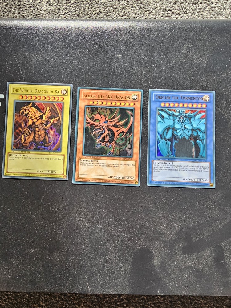 For all Yu-Gi-Oh! TCG enthusiasts, I present to you the Legendary Collection set, which includes the rare and highly sought after trio of Egyptian God Cards. These legendary cards have been re-released for the 25th anniversary of the franchise and are sure to be a valuable addition to any collection. This set comes with the three God Cards, namely Slifer the Sky Dragon, Obelisk the Tormentor, and The Winged Dragon of Ra, all in their original artwork and available as promo cards. The cards are in excellent condition and perfect for both collectors and players alike. Don't miss the chance to add these iconic cards to your collection.