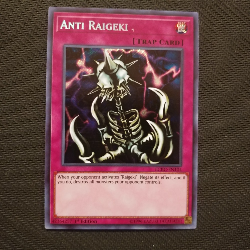 This Anti Raigeki card is a fantastic addition to any Yu-Gi-Oh! collection! The Secret Rare foil looks stunning, and the condition is nearly perfect—just a tiny bit off from mint. Shipping was fast, and the seller was super responsive. Definitely recommend for players or collectors looking for a high-quality card at a great value!