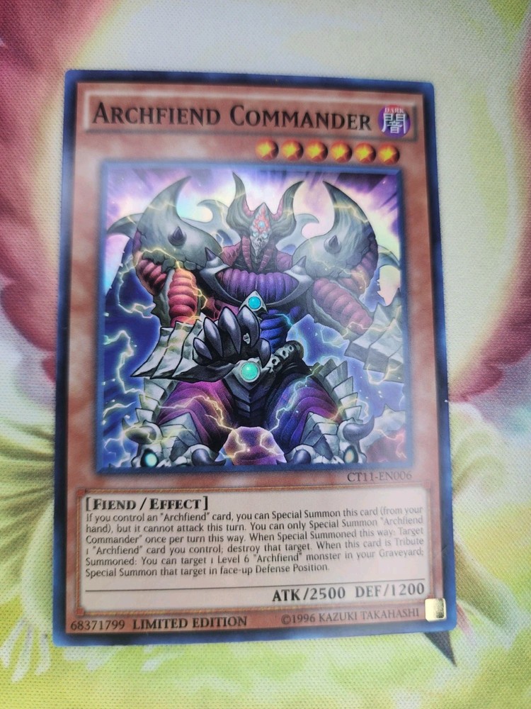 This is a Yu-Gi-Oh trading card featuring the character Archfiend Commander. It is from the 2014 Mega Tins set and is a Limited Edition Super Rare card. The card has a Holo finish and is in moderately played (Very good) condition. It is in English and has the card number CT11-EN006. This card is an Effect type creature/monster card made of card stock.