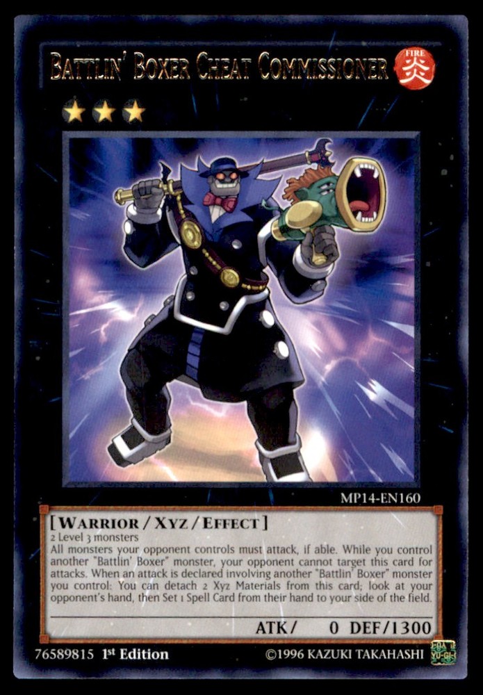 About Me Other Listings Feedback Add to Favorites Contact Me Bluenose Yu-Gi-Oh! Battlin' Boxer Cheat Commissioner #MP14-EN160 1st Edition Near Mint No stock photo / These are real scans or pictures Details Description: Battlin' Boxer Cheat Commissioner Category: Yugioh Year: 1996 Product: Yu-Gi-Oh! Card Number: MP14-EN160 Special: 1st Edition Near Mint Dimensions: 3¼" x 2¼" SKU: YU B0004 R02 N (1) Payment Payment for buy it now is required immediately and for auctions it must be paid within 72 hours. Shipping Shipments usually make their way out in 1-2 business days. Returns and Claims Please view listing photo and description prior to purchase of card to make sure the card and condition is right for you! About Us Please keep in mind the following conditions .-------------------------------------------Near Mint: a card that shows very little to no signs of ware or usage such as very little whiting. -------------------------------------------Light Play: A card that shows signs of ware such as but not limited to whiting, slight bend or scratches. -------------------------------------------Heavy Play: A card that shows signs of ware, whiting, bending, creasing, folding or other various issues.-------------------------------------------Damaged: a card in very bad condition can have some or all of the above mentioned condition notes including peeling, stains, writing, etc.-------------------------------------------The photo in ads are the EXACT card you will recieve. Listing By Kronocard trading cards software v2.8.2.3