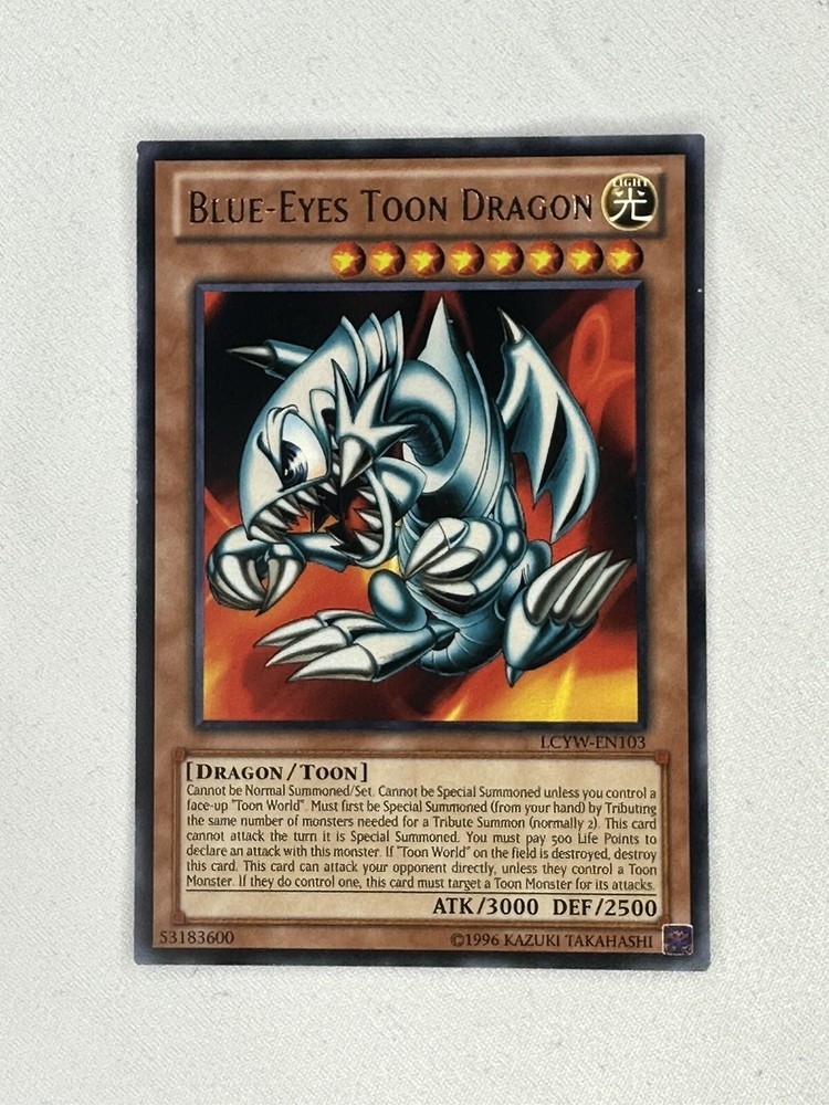 If you're a fan of the classic anime series Yu-Gi-Oh! and you're looking for a rare and collectible item, then this Blue-Eyes Toon Dragon card is perfect for you! This English-language card from the Yu-Gi-Oh! TCG features a light-colored, Japanese-sized design with a regular finish and unlimited features. The card comes from the Legendary Collection 3: Yugi's World set and has the card number LCYW-EN103. This rare Toon-type card is sure to impress any collector or fan of the series, with its unique design and rarity. The card does not come with a description of its condition, but rest assured that this card is in great shape and ready to be added to your collection.