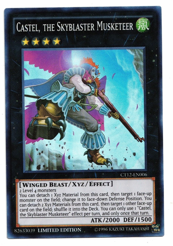 This listing is for a great Yu-Gi-Oh! Card. You get: Castel, the Skyblaster Musketeer CT12-EN006 Limited Edition Super Rare! This card is in Near Mint Condition. Actual card pictured, please see scan for details. WE COMBINE SHIPPING! ORDER TOGETHER TO SAVE! CONDITION DEFINITIONS: Mint : A perfect or virtually perfect card. We do not sell cards as Mint in order to ensure customer satisfaction. Near Mint : May have some very light edge wear and/or scratching. Excellent : Edge wear and/or scratches becoming more noticeable. May have a few light indentations. Good : Shows signs of play. Has bends, scratches, indentations, minor creases, and/or increasing edge wear. Played : Severe bends, creases, edge wear and/or scratches. Damage is extremely noticeable. POKEMASTER.CARDS SALES INFORMATION: History/Background We specialize in high quality collectibles with great prices, accurate descriptions, and super fast shipping. With thousands of items sold, you can be confident that you will be very happy with your purchase! We add new items all the time, be sure to add us to your Favorite Sellers List. Click the "Save this seller" link above or in our store! Shipping Information Cards are safely packed in a protective plastic sleeve, wrapped in a packing slip, and then reinforced with cardboard and tape. Most cards are shipped via USPS First Class Mail, which usually arrives quickly (within 3-6 business days). WE COMBINE SHIPPING! Be sure to order items together to save big! Customer Service As you can see from our great feedback, we work very hard to ensure that EVERY customer is fully satisfied. Please contact us with ANY concerns BEFORE leaving feedback and we will promptly address any issue. We want 5 STARS in every category and will do what it takes to earn them.