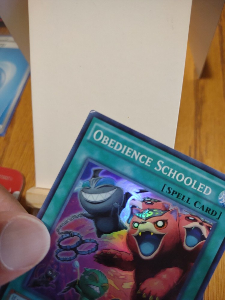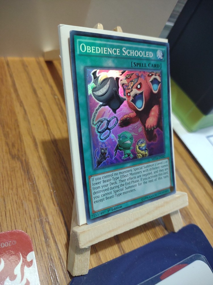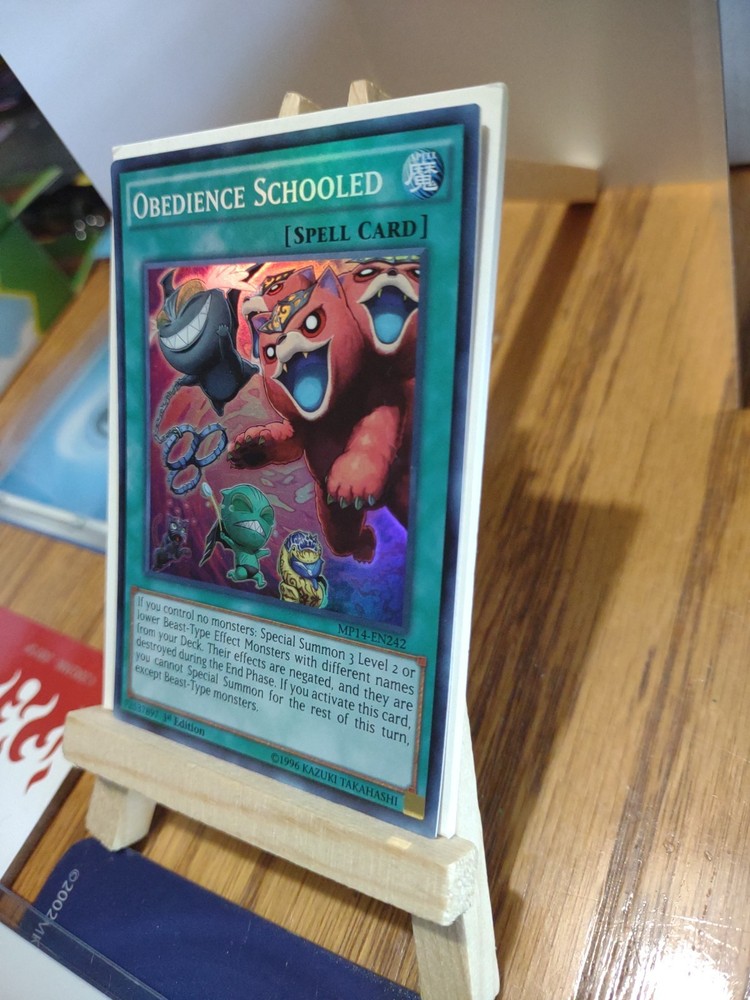 The product is a Yu-Gi-Oh card from the 2014 Mega-Tins Mega Pack set, specifically the "Obedience Schooled" card. This Super Rare 1st Edition collectable item features a Spell attribute, special summon ability, and belongs to the Beast creature type. Manufactured by Konami, the card is in English language with a holo finish, making it a sought-after piece for collectors and players of the Yu-Gi-Oh trading card game. Card has some edge ware and other imperfections see pictures for the condition of this item. Thank you