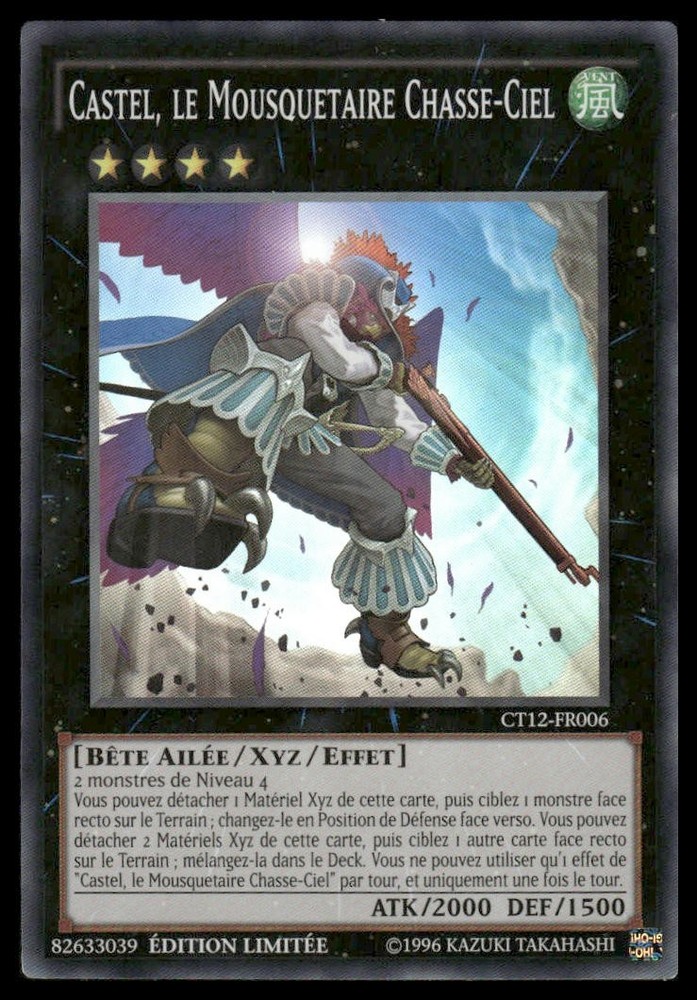 This listing is for the card YuGiOh Castel Le Mousquetaire Chasse-Ciel #CT12-FR006 French LE SR. This card is in Near Mint condition! Please see photos for condition as the card pictured is the exact card you will receive.