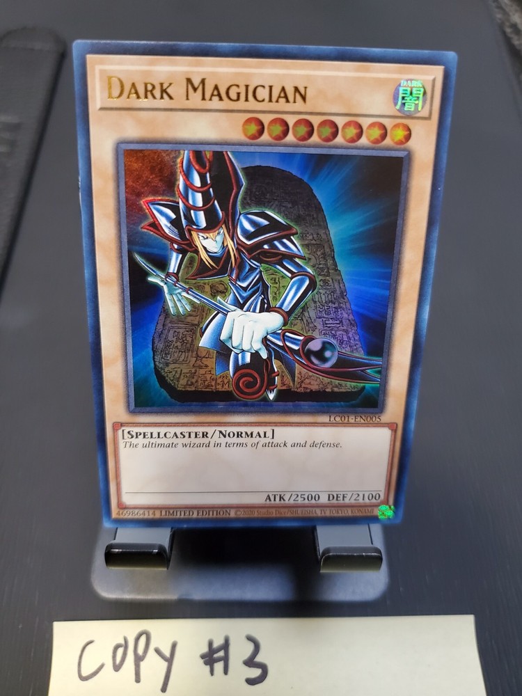 Dark Magician LC01-EN005 is from the Legendary Collection . The card is in Near Mint condition! Shipping: I will be mailing this card through a #6 envelope. The card will be sleeved, placed in a Toploader, blue tape sealing the top of the Toploader, inserted in a cellophane bag, and wrapped around with paper. If you have any questions regarding the card or shipping, please feel free to message me anytime!