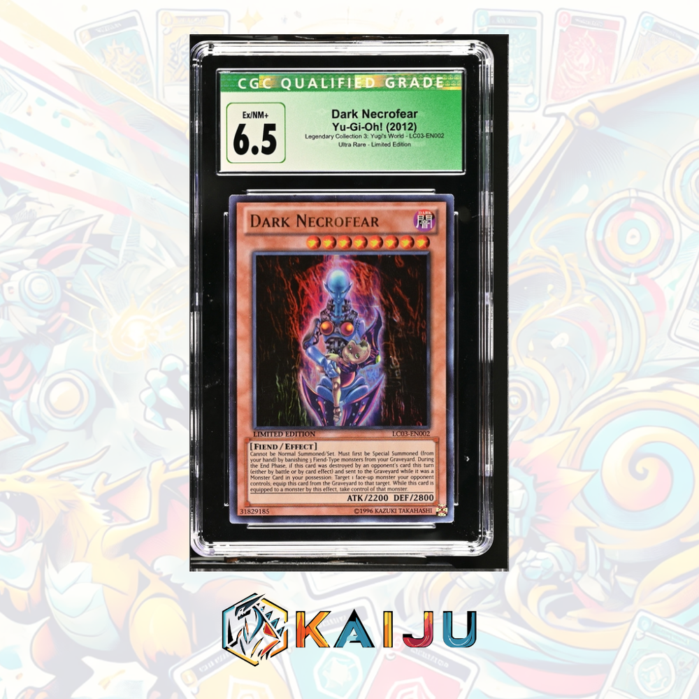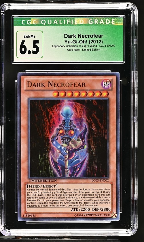 CGC 6.5 Qualified Grade - looks to have some dots of sharpie, or marker in places Unleash the power of Darkness with the iconic Dark Necrofear from the 2012 Legendary Collection 3: Yugis World set, card number LC03-EN002. This Ultra Rare card, featuring the formidable Fiend creature/monster type, is a must-have for any serious Yu-Gi-Oh! TCG collector or player. Crafted by Konami, it's a Limited Edition piece that brings a touch of the sinister to your deck or display. With its distinct attributes, the Dark Necrofear card is more than just a game piece; it's a symbol of strategic gameplay and a treasured collectible. Whether you're looking to enhance your game experience or to complete your collection with a card of exceptional rarity, this piece is sure to elevate your assortment.