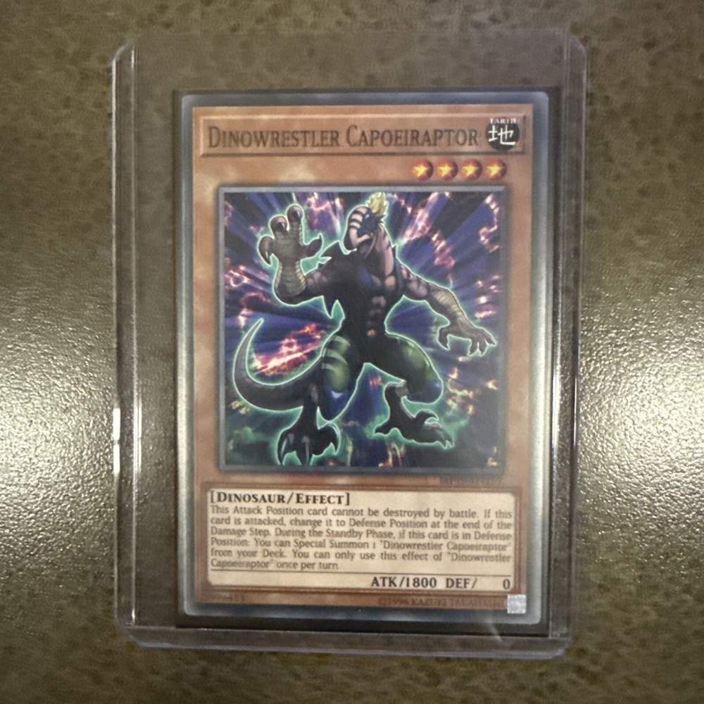 YuGiOh! card named Dinowrestler Capoeiraptor from the 2019 Mega-Tins: Gold Sarcophagus set. It is a Common 1st Edition card with the attribute Earth. The card features a Dinosaur creature type and has...