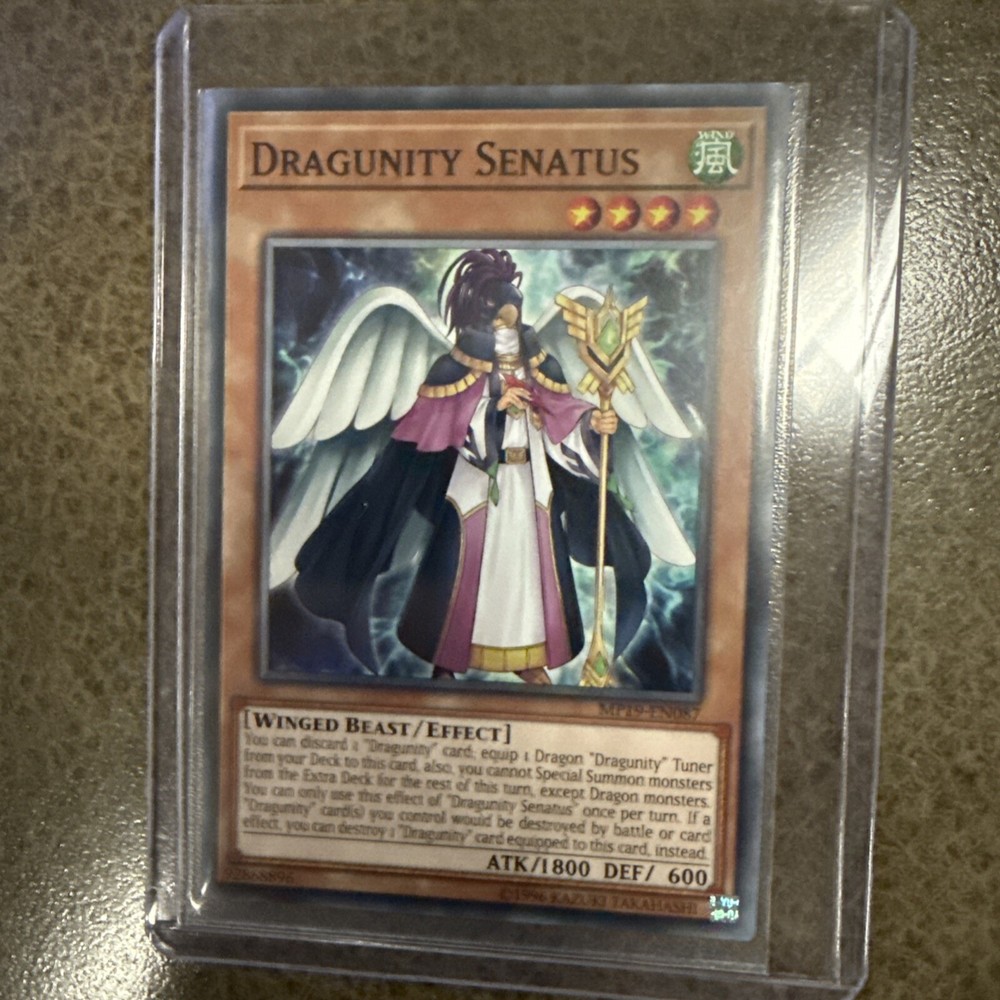 YuGiOh! - Dragunity Senatus is a Common 1st Edition card from the 2019 Mega-Tin: Gold Sarcaphagus set. It features a Winged Beast creature with the Attribute of Wind. The card is of the Card Type Effect and has the Card Number Mp19-EN087.