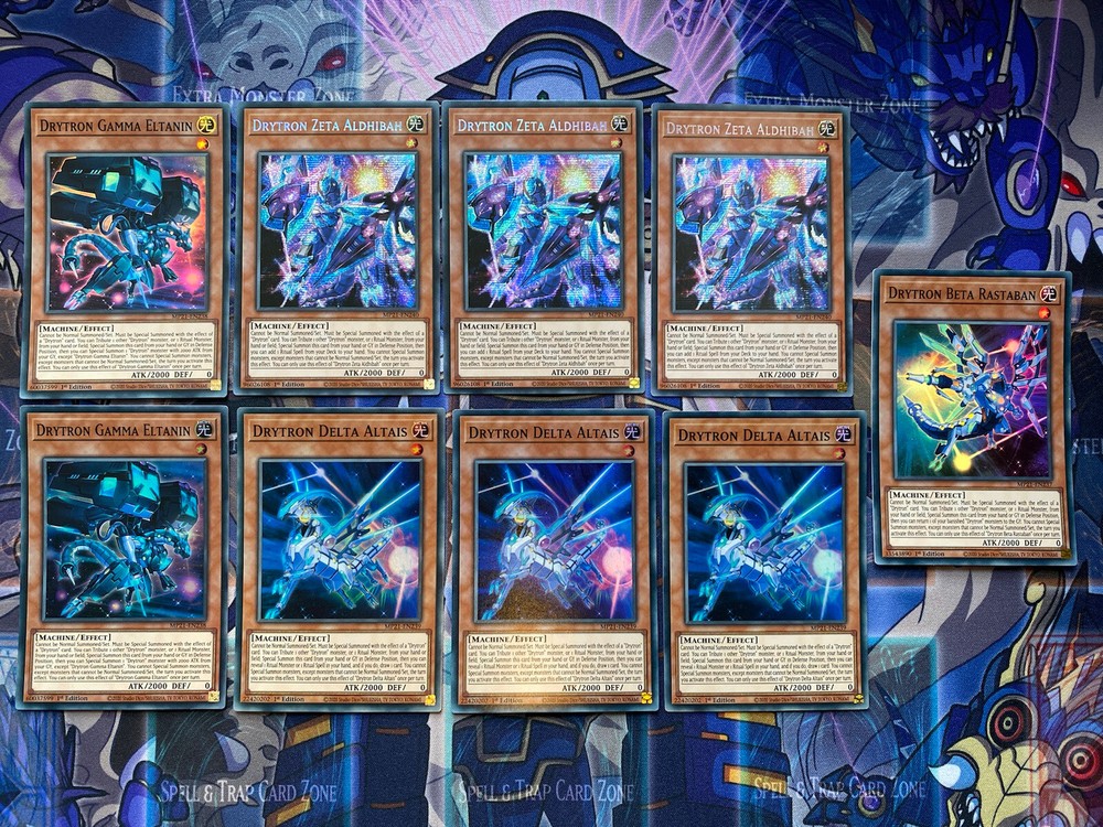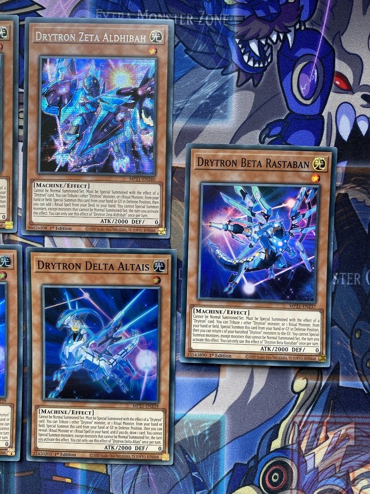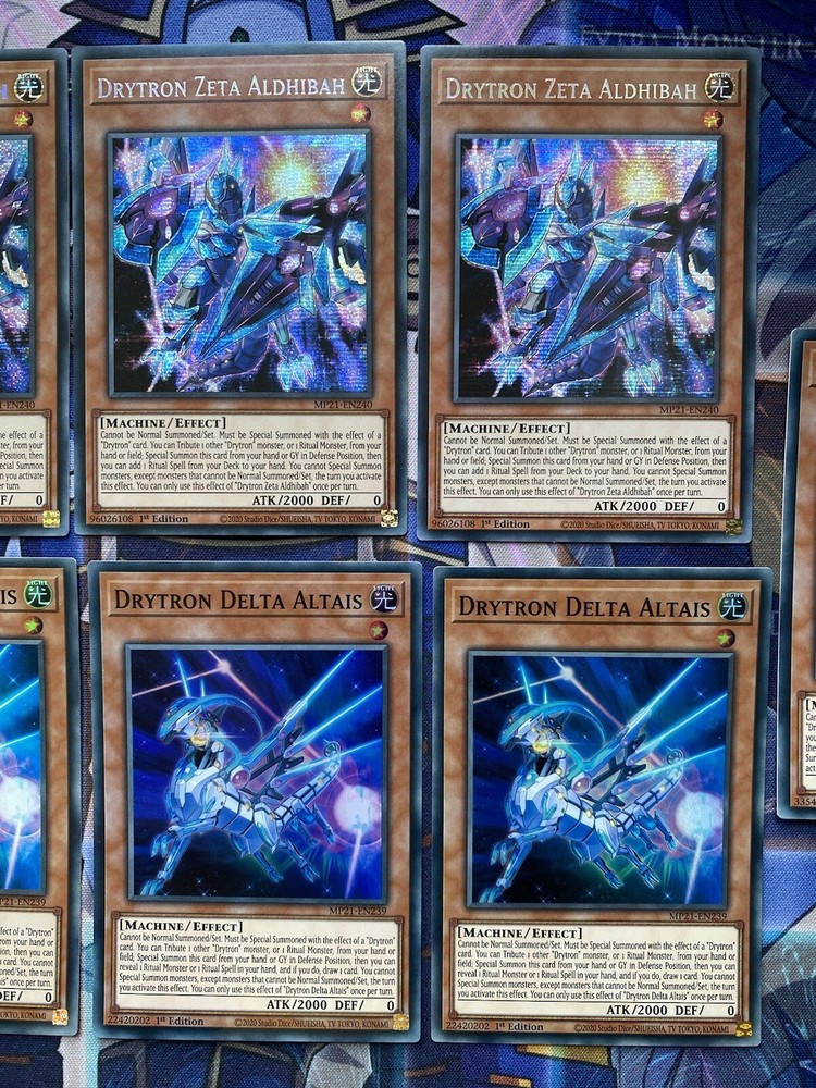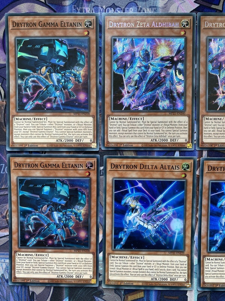 YuGiOh! Drytron Zeta, Delta, Gamma, Beta Mega Tin 2021 bundle. Dryton Gamma Eltanin x 2 Drytron Zeta Aldhibah x 3 Dryton Delta Altais x 3 Drytron Beta Rastaban x 1 All brand new and pack fresh from Mega Tin 2021 packs.