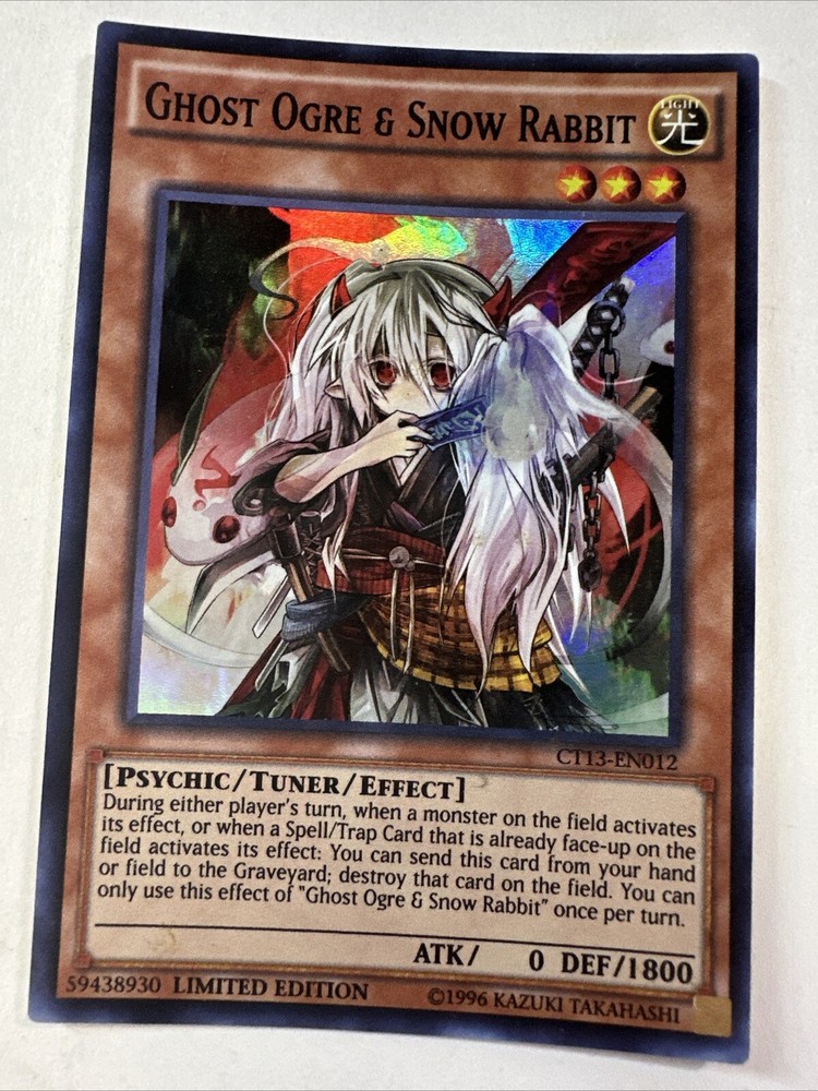 This limited edition super rare card features the characters Ghost Ogre & Snow Rabbit from the Yu-Gi-Oh! TCG game. The card is made from card stock material with a holo finish and is part of the 2016 Mega Tins set. It is a tuner card with the card number CT13-EN012, manufactured by Konami in the United States. The card is in standard size and in English language. It is suitable for children aged 6+ and is not vintage. The card is not autographed and is not considered as a collectible item.