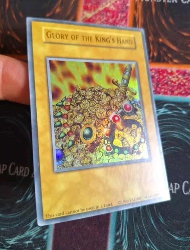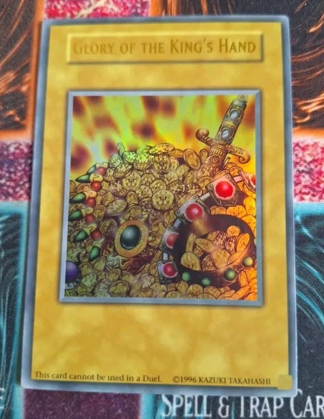 The Yu-Gi-Oh! card "Glory of the King's Hand" is part of the King of Games: Yugi's Legendary Decks set, manufactured by Konami. This Ultra Rare card features a Holo finish and is a Limited Edition non-game card in English language, designed on Japanese card stock. A sought-after collectible for Yu-Gi-Oh! TCG enthusiasts, this card embodies the iconic elements of Yugi's legendary decks, making it a valuable addition to any collection.