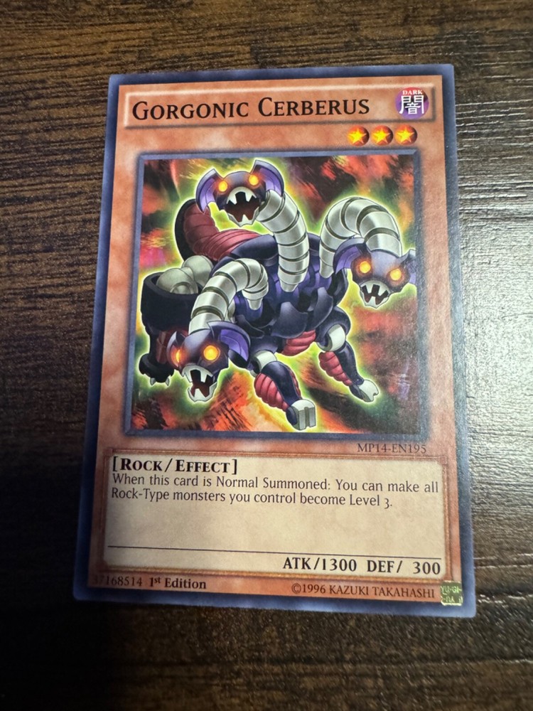 Dive into the world of strategic duels with the Yu-Gi-Oh! Gorgonic Cerberus card, a formidable addition to any deck. From the 2014 Mega-Tins Mega Pack, this card bears the distinction of being a 1st Edition, common/short print rarity that exudes collectible appeal. Its unique Effect type gameplay is enhanced by its Rock specialty, offering a blend of offensive and defensive capabilities with an attack power of 1300 and a defense toughness of 300. Crafted by Konami and designated as MP14-EN195, the Gorgonic Cerberus is a must-have for enthusiasts and competitive players alike. The card is presented in English and is a testament to the enduring legacy of the Yu-Gi-Oh! TCG. Whether you're looking to bolster your gameplay or complete your collection, this card is a quintessential piece for your next move.