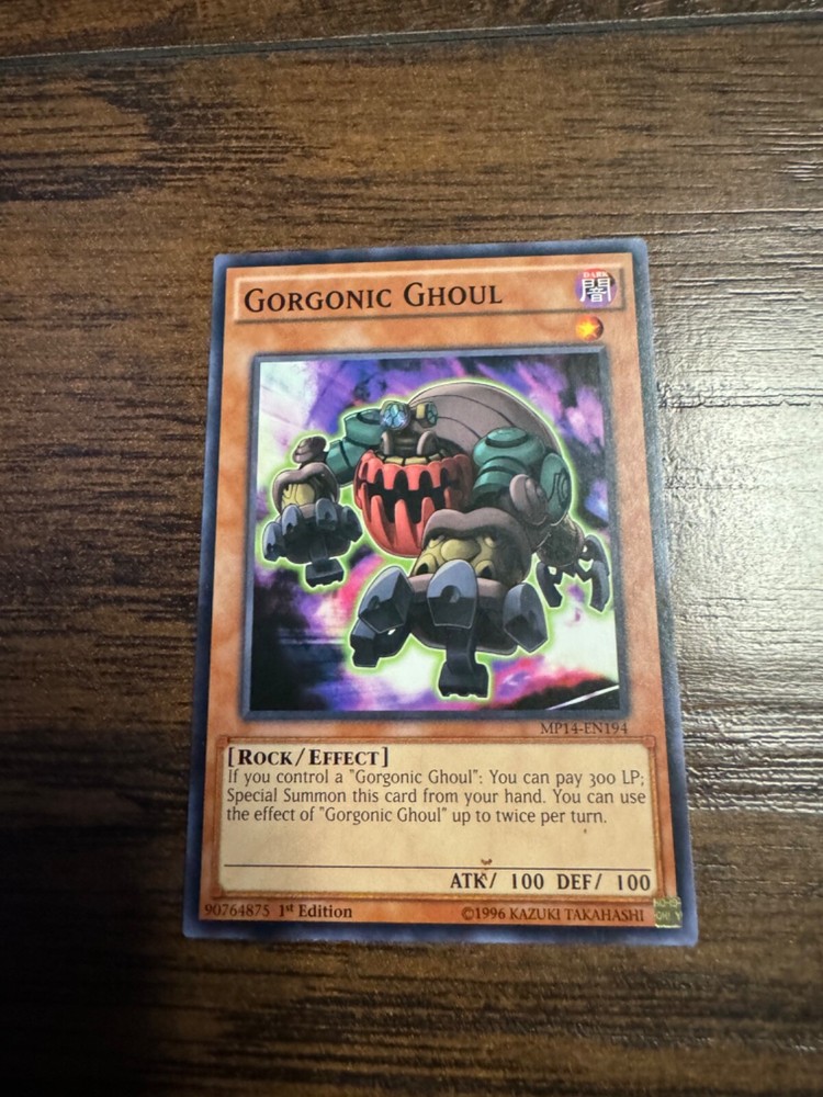 Elevate your Yu-Gi-Oh! TCG collection with the Gorgonic Ghoul card, a formidable addition from the 2014 Mega-Tins Mega Pack. As a 1st Edition Effect-type creature, it brings a unique blend of strategy and power to the table. With its Dark attribute, this card is a versatile choice for players looking to enhance their deck's performance. The Gorgonic Ghoul, card number MP14-EN194, boasts an attack and defense strength of 100, making it a durable contender in any duel. Printed in English and produced by Konami, this common yet short print rarity card is a must-have for both seasoned players and collectors alike.