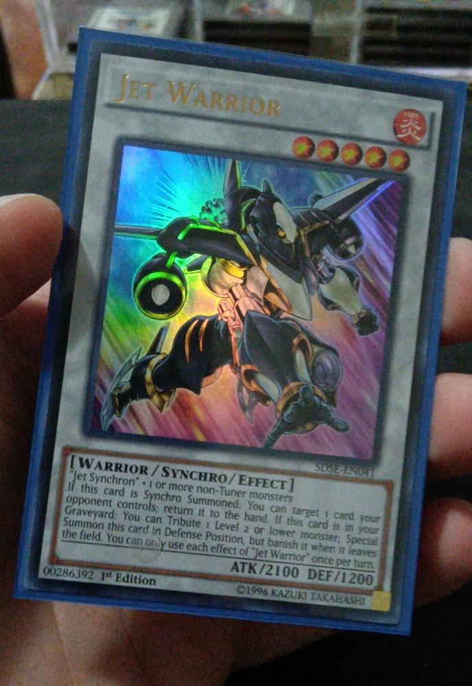 This auction is for only ONE of the Yu-Gi-Oh cards in the picture (zoom in). The NAME of the auction. Comes in protective loader. Great price, free shipping. See the pictures, ZOOM IN to the card. All my cards are MINT CONDITION from a sealed BOOSTER PACK/BOX. Unplayed and MINT! Sharp corners! Comes sleeved in top loader. For collectors or players alike. Auction is for : "Jet Warrior" - ULTRA RARE - Mint Condition! - Sleeved! Card Series : SDSE - (Synchron Extreme - structure deck) - 1st Edition, Freshly Pulled! Paypal payment within 48 hours, USA Buyers Only (sorry, no Canada or foreign), Serious Bidders/Buyers Only. Please do not bid unless you plan to pay. I RESERVE the right to relist my item in 2 days, and sell it to the next customer.