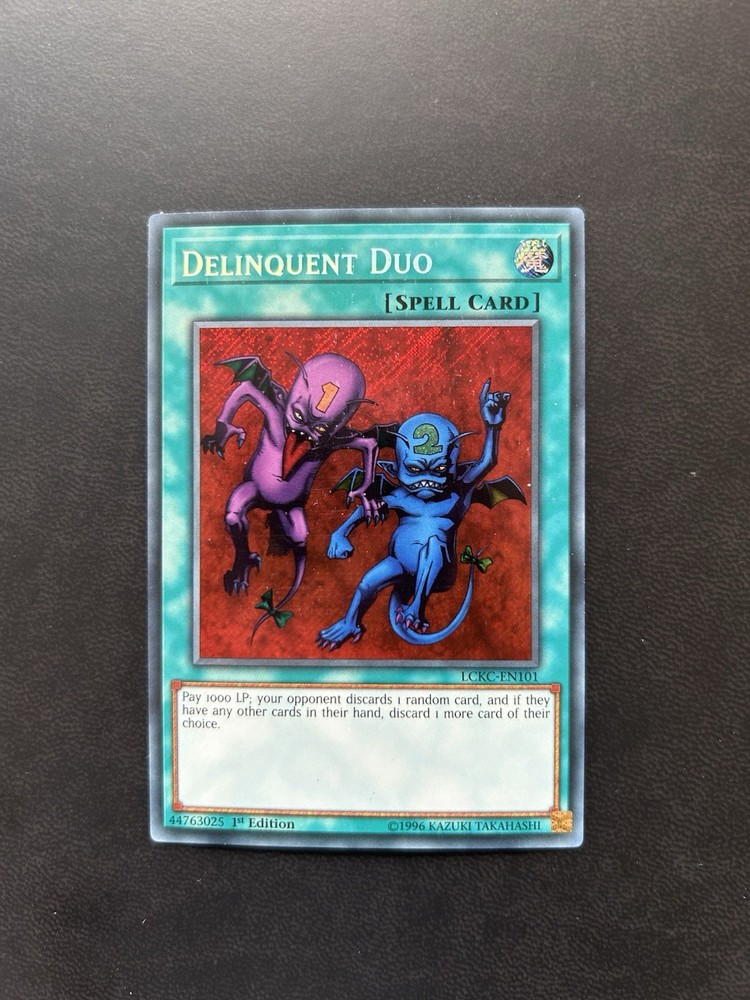 FOR SALE: 1x Yu-Gi-Oh! LCKC-EN101 Delinquent Duo (1st Edition) Secret Rare. Condition is light play (see pictures). Dispatched in secure TopLoader via Royal Mail 1st Class Letter. Please see below for 2025 postage details (applies to all purchases from 04/01/2025) : - Item(s) with value between £1.00 and £4.99 will be dispatched via Royal Mail 2nd class within 2 working days of purchase - Item(s) with value between £5.00 and £40.00 will be dispatched via Royal Mail 1st class within 2 working days of purchase - Item(s) with value greater than £40.00 will be dispatched via Royal Mail 1st class tracked within 2 working days of purchase Returns sadly not accepted.