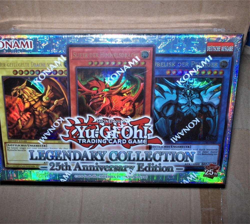Jedes Legendary Collection zum 25. Jubiläum Box Set in deutscher Sprache enthält: - 6 Booster Packs, jeweils ein Booster Pack von: Legend of Blue Eyes White Dragon, Metal Raiders, Spell Ruler, Pharaoh's Servant, Dark Crisis, Invasion of Chaos - Alle 3 legendären Götter-Karten: Obelisk der Peiniger, Slifer der Himmelsdrache & Geflügelter Drache des Ra - Jeweils eine Karte der berühmtesten Monster: Blauäugiger Weißer Drache, Dunkler Magier & Rotäugiger schwarzer Drache. Achtung: Nicht für Kinder unter drei Jahren geeignet !!! NEU,OVP,Lizenzware