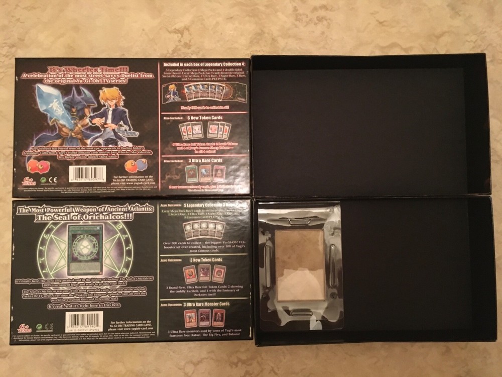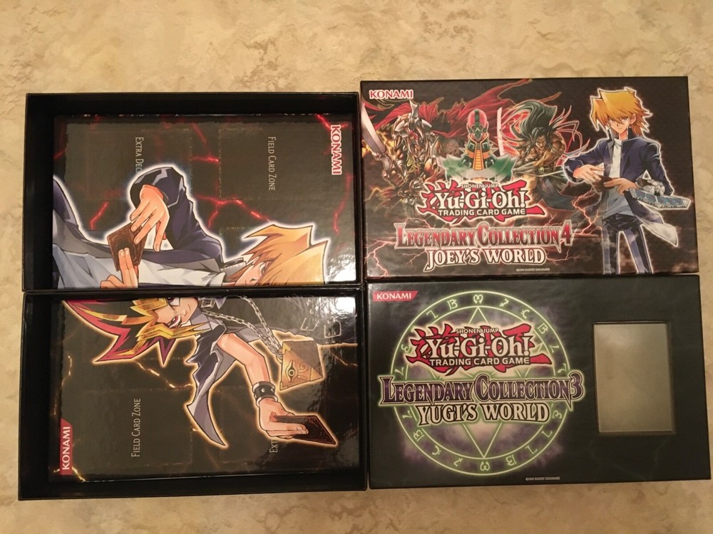 Yu-Gi-Oh! Legendary Collections 3&4 boxes and unused game boards, NO CARDS included..one box and game board is Yugi’s World, Legendary Collection 3, one box and game board is Joey’s World, Legendary Collection 4. Again, there are NO CARDS included with these items.