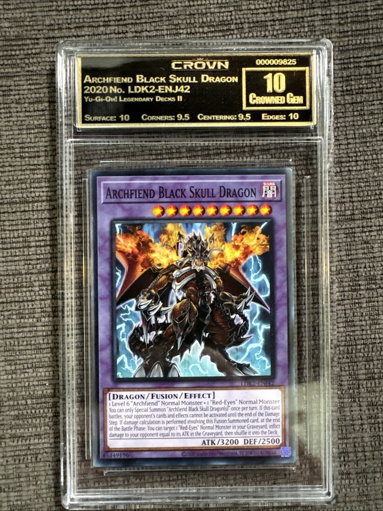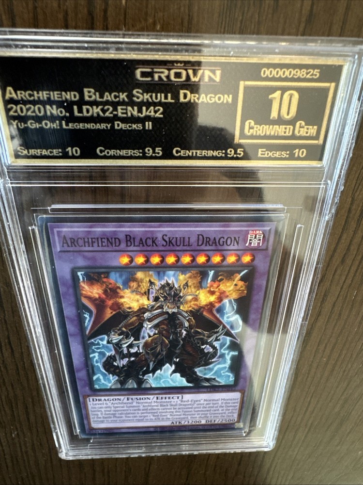 The Yu-Gi-Oh Legendary Decks II Archfiend Black Skull Dragon card is a highly sought-after collectible featuring a dragon character from the Yu-Gi-Oh! TCG. Manufactured by Konami in 2020, this English language card is a part of the Legendary Decks II set and has a dark attribute. With a high grade of 10, this card is in near mint condition or better, making it a valuable addition to any card collection. Its unique design and rarity make it a must-have for fans of the game and collectors alike.