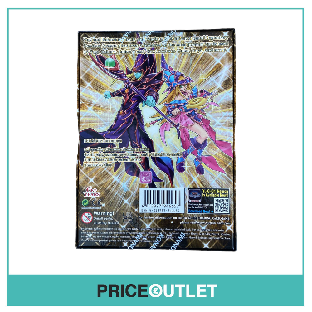Yu-Gi-Oh! - Legendary Duelist: Season 3 - Exclusive Dice Box (NEW & SEALED) ENGLISH Edition OFFICIAL Yu-Gi-Oh! - Legendary Duelist: Season 3 - Exclusive Dice Box ENG Brand New and Sealed Each box contains: - 2 Legendary Duelists: Season 3 packs- 1 of 10 Secret Rare Variant Cards- 1 exclusive dice Yu-Gi-Oh! - Legendary Duelist: Season 3 - Exclusive Dice Box (NEW & SEALED) ENGLISH Edition OFFICIAL Yu-Gi-Oh! - Legendary Duelist: Season 3 - Exclusive Dice Box ENG Brand New and Sealed Each box contains: - 2 Legendary Duelists: Season 3 packs - 1 of 10 Secret Rare Variant Cards - 1 exclusive dice × × × Shipping info Click the Shipping & Payments tab above the listing description for more info Click the Shipping & Payments tab above the listing description for more info! Additional delivery notes PICK UP OPTION Sorry, our items are NOT available for pick-up. PAYMENT Immediate payment is required upon selecting "Buy It Now" or upon checking out through the cart. We accept payment via All Major Credit Cards (Visa, Mastercard, AMEX, Discover), Google Pay, PayPal, & Apple Pay (on mobile & eBay App). Thank you for shopping with us on eBay! Additional Information No additional information at this time Ask seller a question You might also like Funko Kingdom of Hearts Mystery Mini Converse Chuck Taylor All Star - Peace and Stripe Print Trainers - Size 10 1/2 - Toga - Brown Sleeveless Top with Black Lace Accent - Size 1 - BRAND NEW WITH TAG L'Wren Scott - Teal Tailored Silk Skirt - Size 40 - BRAND NEW WITH TAGS Contact To contact our Customer Service Team, simply click the button here and our Customer Service team will be happy to assist. Ask seller a question © Price Outlet UK Shipping & Payments Click the Shipping & Payments tab above the listing description for more info Payment Accepted Payment Methods Immediate payment is required upon selecting "Buy It Now" or upon checking out through the cart. We accept payment via All Major Credit Cards (Visa, Mastercard, AMEX, Discover), Google Pay, PayPal, & Apple Pay (on mobile & eBay App). Thank you for shopping with us on eBay! Returns Returns are accepted Items must be returned within 14 days of the auction ending Buyer will pay for return shipping. eBay integration by