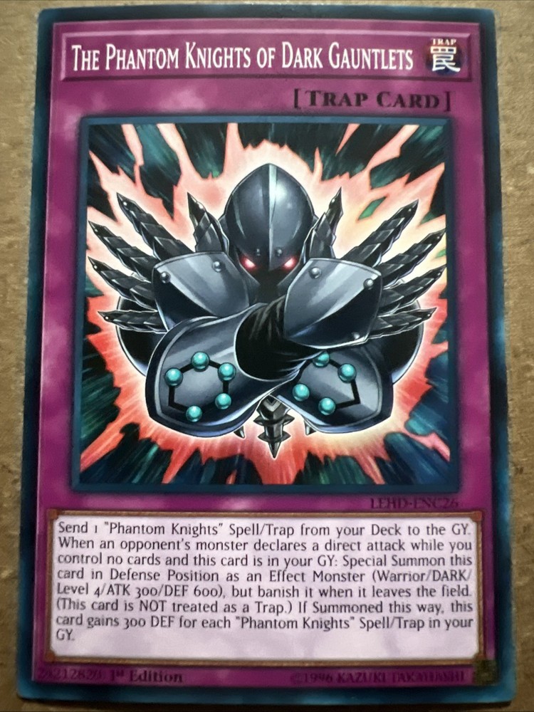 The YuGiOh Legendary Hero Decks - The Phantom Knights Of Dark Gauntlets LEHD-ENC26 is a collectible card game item for Yu-Gi-Oh! TCG. This 1st Edition English card features Dark attribute, is a Trap-Normal type card, and is part of the Legendary Hero Decks set. Manufactured by Konami, this standard-sized card is made of card stock with a regular finish, making it a desirable addition for collectors and players alike. With its unique design and gameplay potential, this card is sure to be a valuable addition to any Yu-Gi-Oh! card collection.