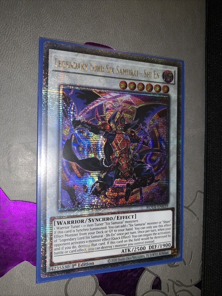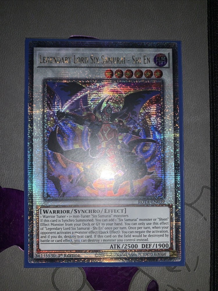 This Yu-Gi-Oh! TCG card features the legendary Lord Six Samurai, named ShiEn, with a rare ROTA-EN039 card number. The card is a Quarter Century Rare collectable, perfect for any Yu-Gi-Oh! fan or collector. The card type is a Lord creature/monster, making it a unique addition to any deck. The card name is Samurai and it is from the Collectable Card Games category, under Collectables. It is a must-have for any serious Yu-Gi-Oh! collector. Don't miss the opportunity to add this rare and powerful card to your collection.
