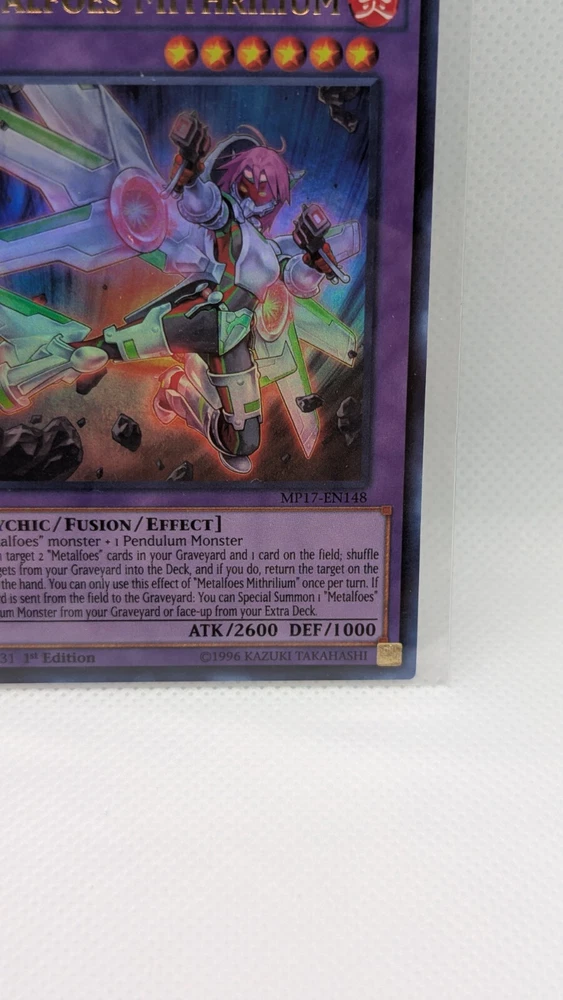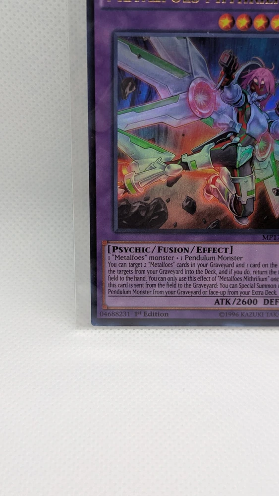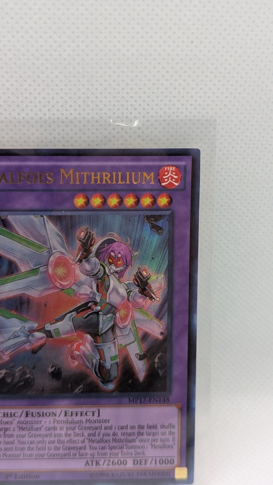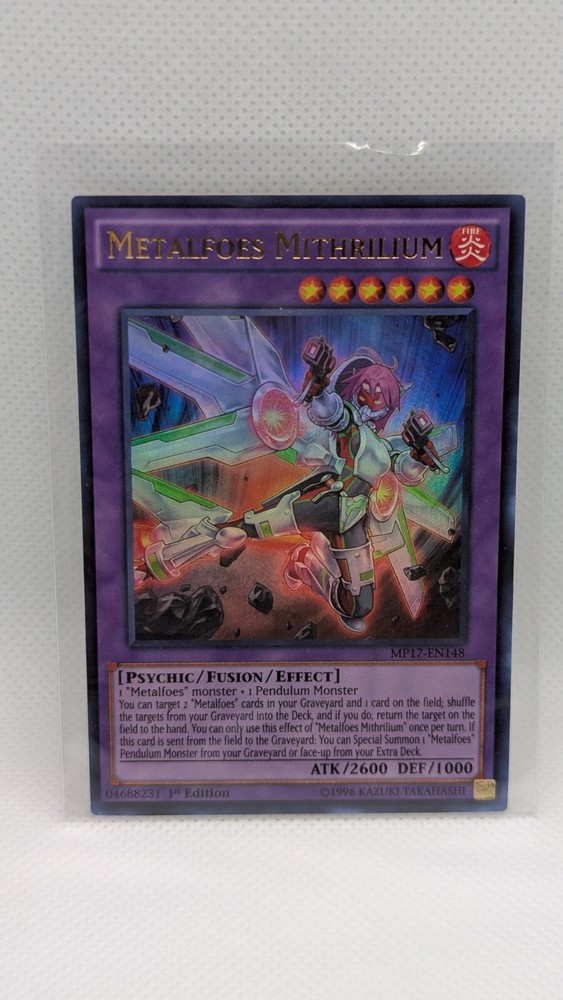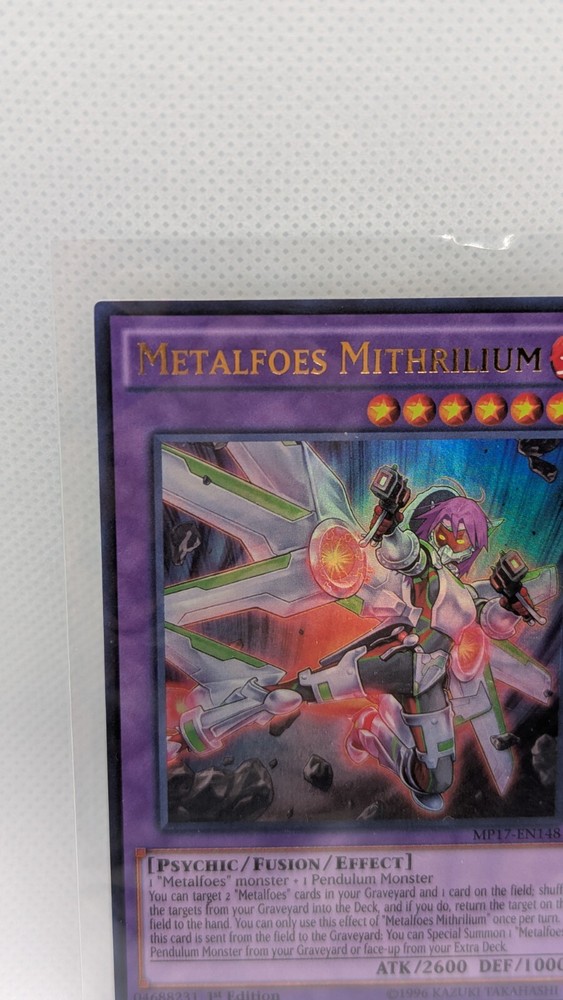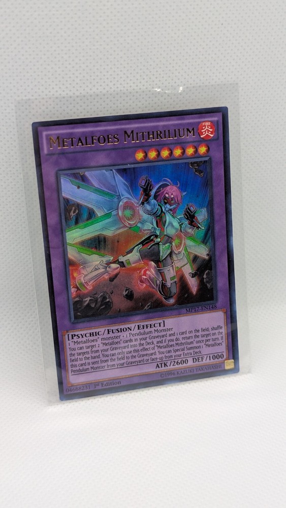 Same Day Shipping, Always Pack Fresh, Always Near Mint The Yu-Gi-Oh! card is a Metalfoes Mithrilium from the 2017 Mega-TiN Mega Pack set, featuring a Psychic type creature with the attribute of Fire. This Japanese card is in English and is a 1st Edition Ultra Rare with a holographic finish, manufactured by Konami in the United States. The card number is MP17-EN148 and it is part of the Yu-Gi-Oh! TCG game, making it a sought-after collectible for card game enthusiasts.
