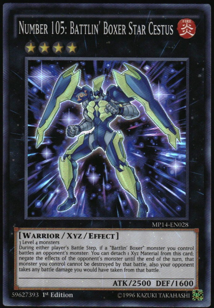 Yu-Gi-Oh! - Number 105: Battlin' Boxer Star Cestus MP14-EN028 SR 1st Edition Yu-Gi-Oh! - Number 105: Battlin' Boxer Star Cestus MP14-EN028 SR 1st Edition Yu-Gi-Oh! - 2014 Mega-Tin Mega Pack Number 105: Battlin' Boxer Star Cestus 2014 MP14-EN028 Super Rare 1st Edition Details Set: 2014 Mega-Tin Mega Pack Card: Number 105: Battlin' Boxer Star Cestus Number: MP14-EN028 Manufacturer: Yu-Gi-Oh! Year: 2014 Variation: Super Rare Version: 1st Edition Notes: Images on listing are scans of actual card you will receive, please use photos to determine condition. Card will be stored and shipped in a protective toploader. We sell collectible merchandise, with conditions ranging from used, vintage to brand new. We do our best to accurately describe the features and condition of each item. Due to the nature of these products, the item and/or original packaging may have handling wear, aging, etc. Please carefully review the description and photos to evaluate the condition of the item to ensure it meets your expectations prior to purchase. We do not use stock images , each photo on this listing is of the actual item for sale. We do offer combined shipping for multiple items going to the same address. Of course, feel free to ask us any questions you may have! Thank you for shopping with us. Please visit our eBay store to check out our other collectible items! Welcome Shipping Returns Thanks for stopping by our store! We appreciate the opportunity to earn your positive feedback and share our unique collection with you! If you have any concerns, please contact us immediately so we can assist you. We are very responsive and happy to assist. Here at Back in the Day, we are pleased to share our collection of vintage and modern collectibles with you. From classic movie, music and gaming memorabilia to pop culture toys and so much more, take home a piece of nostalgia from our ever-changing stockroom. Be sure to browse all our categories frequently so you don't miss out on that rare find! Shipping Speed We are proud to provide fast service to our customers; your order will be shipped within 1 business day of placing your order. On average, domestic First Class/Ground Advantage packages arrive in 5-7 business days (depending on destination). On average, domestic Priority packages arrive in 3-5 business days (depending on destination). On average, FedEx Ground/Home packages arrive in 2-6 business days. We observe all government holidays. We cannot guarantee delivery dates. Packaging We take care in packaging each order - you can rest assured that your items will be thoughtfully packaged to minimize risk and arrive safely to you. Combined Shipping We're happy to combine shipping for multiple items going to the same address.* Multiple items should auto-combine in your cart, but if not, you can request an invoice with combined shipping. We will choose the lowest cost shipping option during fulfillment meeting all carrier weight and policy requirements. *We are unable to combine shipping on auction orders for separate auctions (auctions ending on different dates). Orders must be paid within four days from auction end, or will be cancelled. Additional Once we ship your order, we will provide you tracking information. If you do not receive your shipment within 11 business days of placing your order, feel free to contact us and we’ll be happy to investigate it further. If an item is returned to us due to an incorrect or incomplete address entered during purchase, the buyer is responsible for paying shipping cost if they want the item resent. If the item will not be resent, the buyer will be issued a refund for the cost of the item, not the cost of shipping paid. Please review your shipping details to ensure successful delivery. Please also note that the shipping rates for items we sell are weight-based. We will choose the most cost-efficient delivery method for your order based on weight and size. To reflect the policies of the shipping companies we use, all weights will be rounded up to the nearest pound or ounce, depending on the carrier requirements. We are always available if you have questions! We value your business. Just let us know what you need help with and we will respond quickly. If an item is damaged in shipping, we will be happy to help. Please contact us with your order number and details, including pictures of the damaged item within 30 days of purchase. Due to the nature of the products we sell, and the fact that many are vintage and not new merchandise, items are not eligible for return without reasonable cause. Please take care in reviewing product descriptions and photos before placing your order to be fully aware of the condition of the item. Feel free to ask any questions you may have about an item and we will respond as soon as possible.
