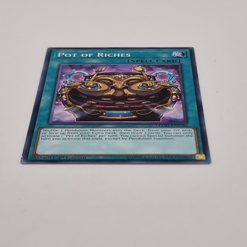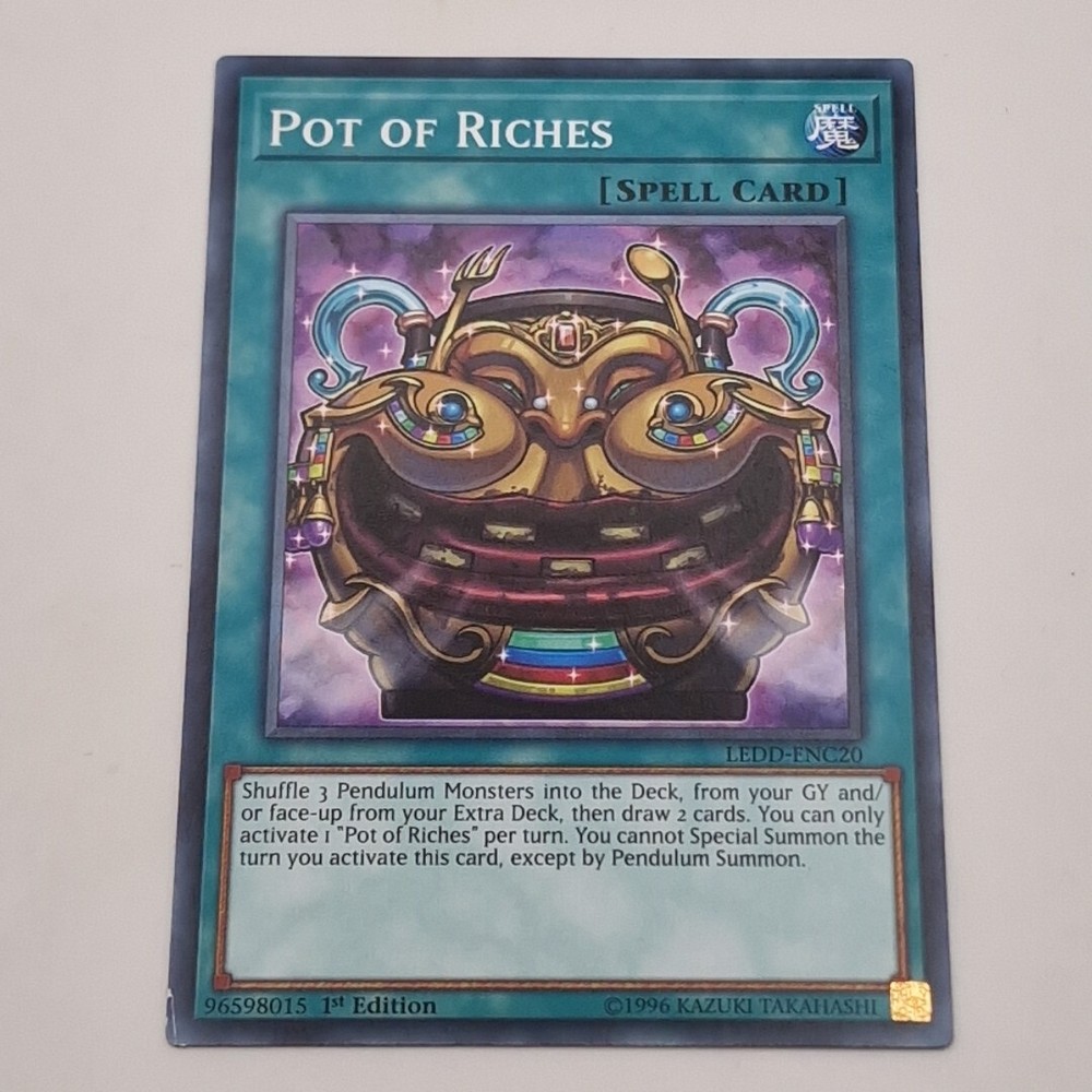 Yu-Gi-Oh! Pot of Riches (Spell Card) Legendary Dragon Decks LEDD-ENC20 This is a used card, please look at pics for a more detailed look at condition. Please take a few minutes to have a look at our other listings, we will combine shipping on multiple purchases.