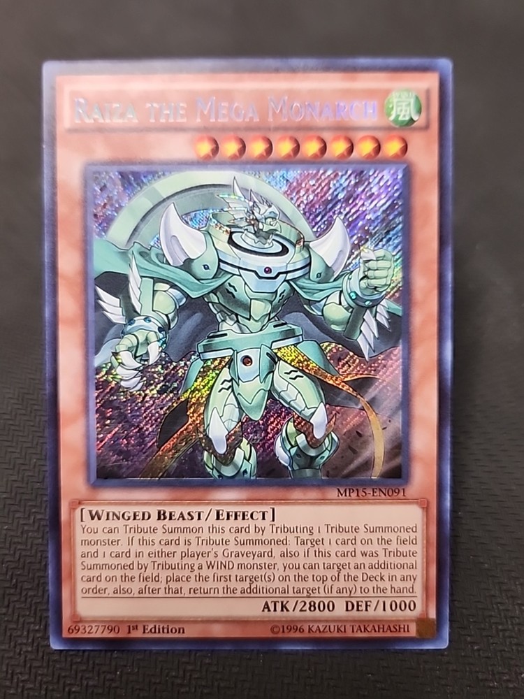 YuGiOh! RAIZA THE MEGA MONARCH: MP15-EN091 SECRET RARE 1st Edition MP Raiza the Mega Monarch | MP15-EN091 | Secret Rare | 1st Edition | Condition: MP Card(s) comes shipped with protective top loader and sleeve Combined Shipping Offered with Other Promo, Magic the Gathering, and Yugioh Cards Only CY-1105