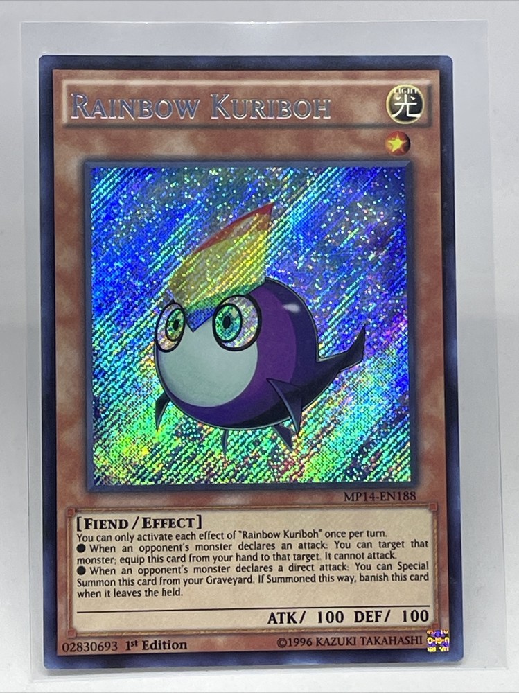 Experience the excitement of the Yu-Gi-Oh! TCG with this Mega Pack 2014 set featuring Rainbow Kuriboh, a Secret Rare card with a foil finish. This card belongs to the Effect type and has an MP14-EN188 card number, making it a must-have for collectors and players alike.