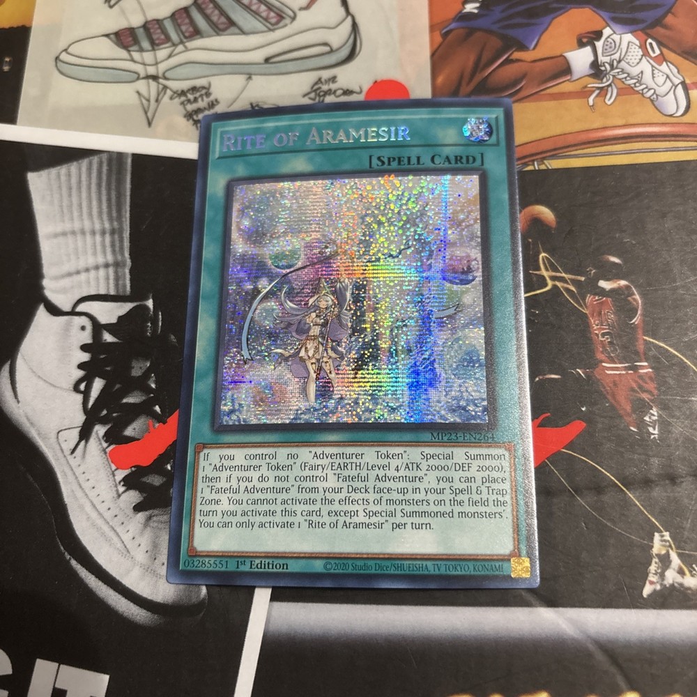 Unleash the power of Rite of Aramesir from the 25th Anniversary Tin: Dueling Heroes Mega Pack to bolster your Yu-Gi-Oh! TCG arsenal. As a Prismatic Secret Rare card, it stands out with its unique holographic design, making it a must-have for collectors and players alike. The card's 1st Edition status ensures it's a sought-after addition to any deck or display. MP23-EN264 is the card number for Rite of Aramesir, and it's presented in English, allowing for wide accessibility within the Yu-Gi-Oh! community. Konami, the esteemed manufacturer, ensures the quality and authenticity of this Spell-Normal card, which is perfect for those looking to enhance their game with a touch of nostalgia and power.
