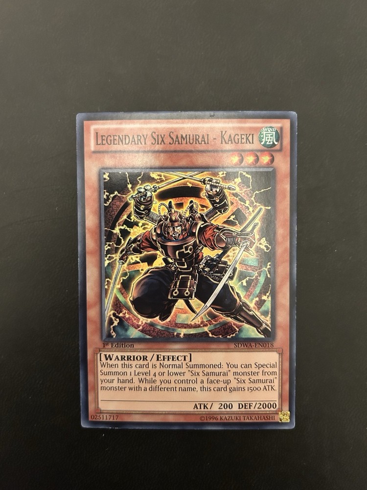 FOR SALE: 1x Yu-Gi-Oh! SDWA-EN018 Legendary Six Samurai - Kageki (1st Edition) Super Rare. Condition is light play (see pictures). Dispatched in secure TopLoader via Royal Mail 2nd Class Letter. Please see below for 2025 postage details (applies to all purchases from 04/01/2025) : - Item(s) with value between £1.00 and £4.99 will be dispatched via Royal Mail 2nd class within 2 working days of purchase. - Item(s) with value between £5.00 and £40.00 will be dispatched via Royal Mail 1st class within 2 working days of purchase. - Item(s) with value greater than £40.00 will be dispatched via Royal Mail 1st class tracked within 2 working days of purchase Returns sadly not accepted.