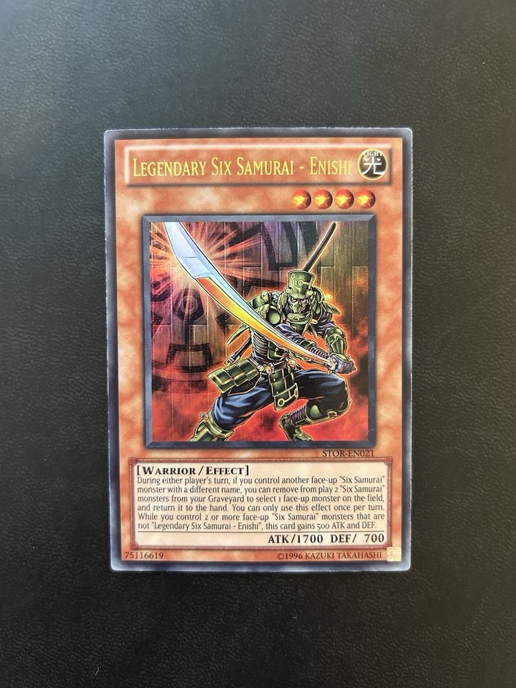 FOR SALE: 1x Yu-Gi-Oh! STOR-EN021 Legendary Six Samurai - Enishi (Unlimited Edition) Ultra Rare. Condition is light play (see pictures). Dispatched in secure TopLoader via Royal Mail 2nd Class Letter. Please see below for 2025 postage details (applies to all purchases from 04/01/2025) : - Item(s) with value between £1.00 and £4.99 will be dispatched via Royal Mail 2nd class within 2 working days of purchase. - Item(s) with value between £5.00 and £40.00 will be dispatched via Royal Mail 1st class within 2 working days of purchase. - Item(s) with value greater than £40.00 will be dispatched via Royal Mail 1st class tracked within 2 working days of purchase. Returns sadly not accepted.
