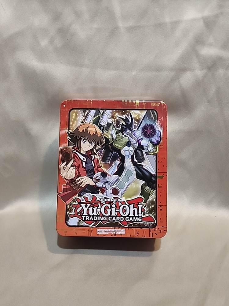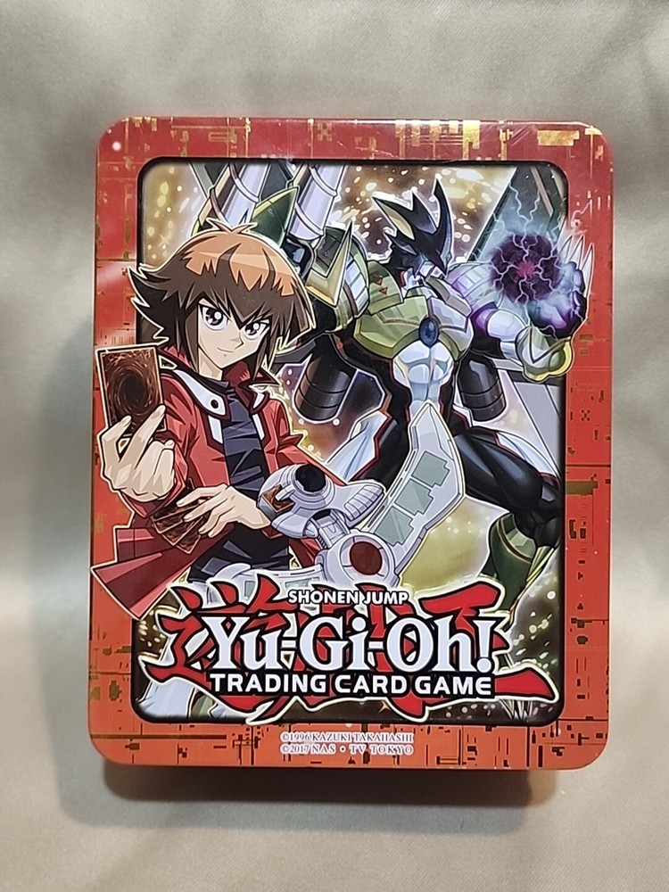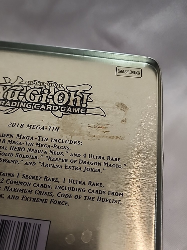 The product is an empty 2018 Yu-Gi-Oh! Shonen Jump Trading Card Game Mega Tin box manufactured by Konami. It is designed for storing trading cards and is part of the Yu-Gi-Oh! franchise....