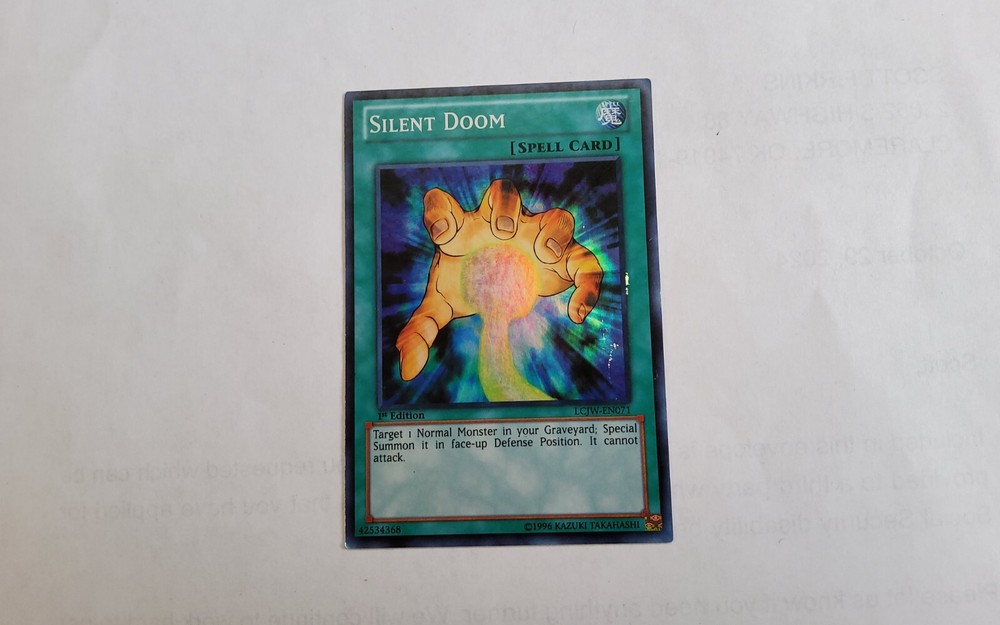 This Yu-Gi-Oh! TCG card is a Super Rare Spell-Normal card from the Legendary Collection 4: Joey's World set. The card name is Silent Doom and it has a card number of LCJW-EN071. It is a 1st Edition card manufactured by Konami and is in English language. This card is perfect for collectors and players alike who are looking for a unique addition to their collection.