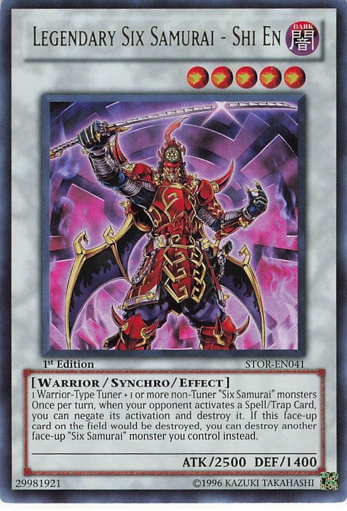 You are purchasing a Yu-Gi-Oh! TCG Storm of Ragnarok Legendary Six Samurai - Shi En #STOR-EN041 1st Edition . Set: Storm of Ragnarok Character: Legendary Six Samurai - Shi En Grade: Near Mint or Better Securely shipped via USPS. You will receive the exact item in the photographs. Thank you for looking. Note: Occasionally, vertical streaks will appear on an image. These are artifacts from the scanning process and the streaks are not on the actual card. Please ask for more photos if you have any concerns. Listed With Mascot .