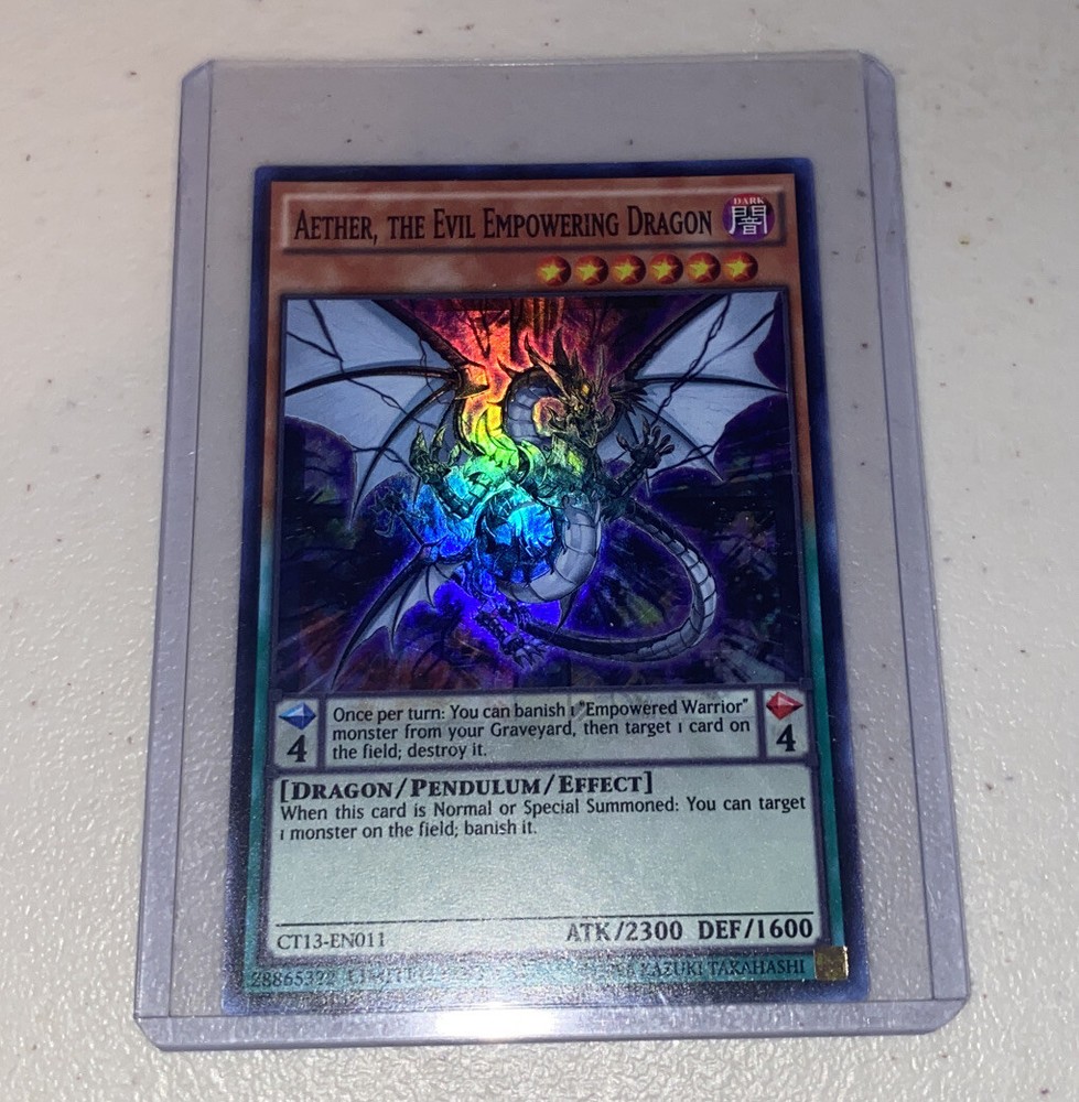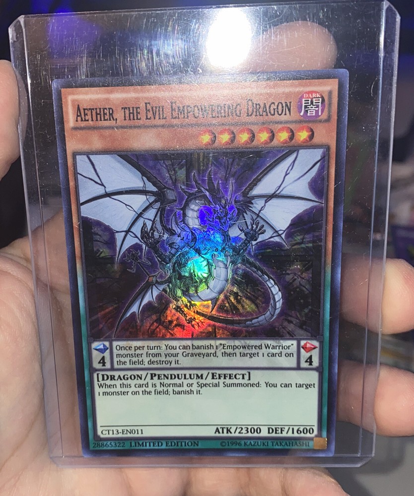 This is brand new never used! Was kept in a toploader! This limited edition Yu-Gi-Oh! TCG card features Aether, the Evil Empowering Dragon. The mighty Dragon/Pendulum/Effect monster boasts a formidable 2300 Attack/Power and a tough Defense/Toughness of 1600. The card belongs to the 2016 Mega-Tins Set and has the card number Ct13-En011. This Dark attribute creature/monster type card is perfect for collectors and players alike. Add it to your collection or use it in your next duel to dominate your opponent. Get your hands on this rare card today!