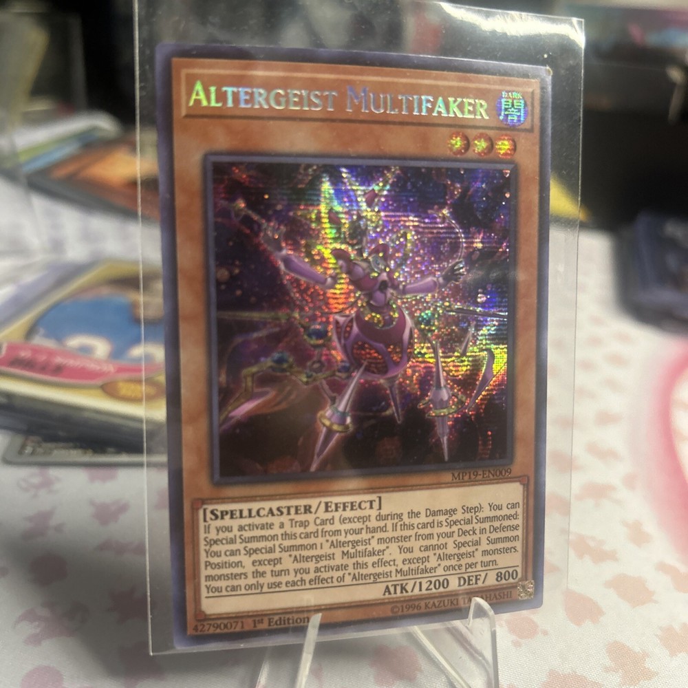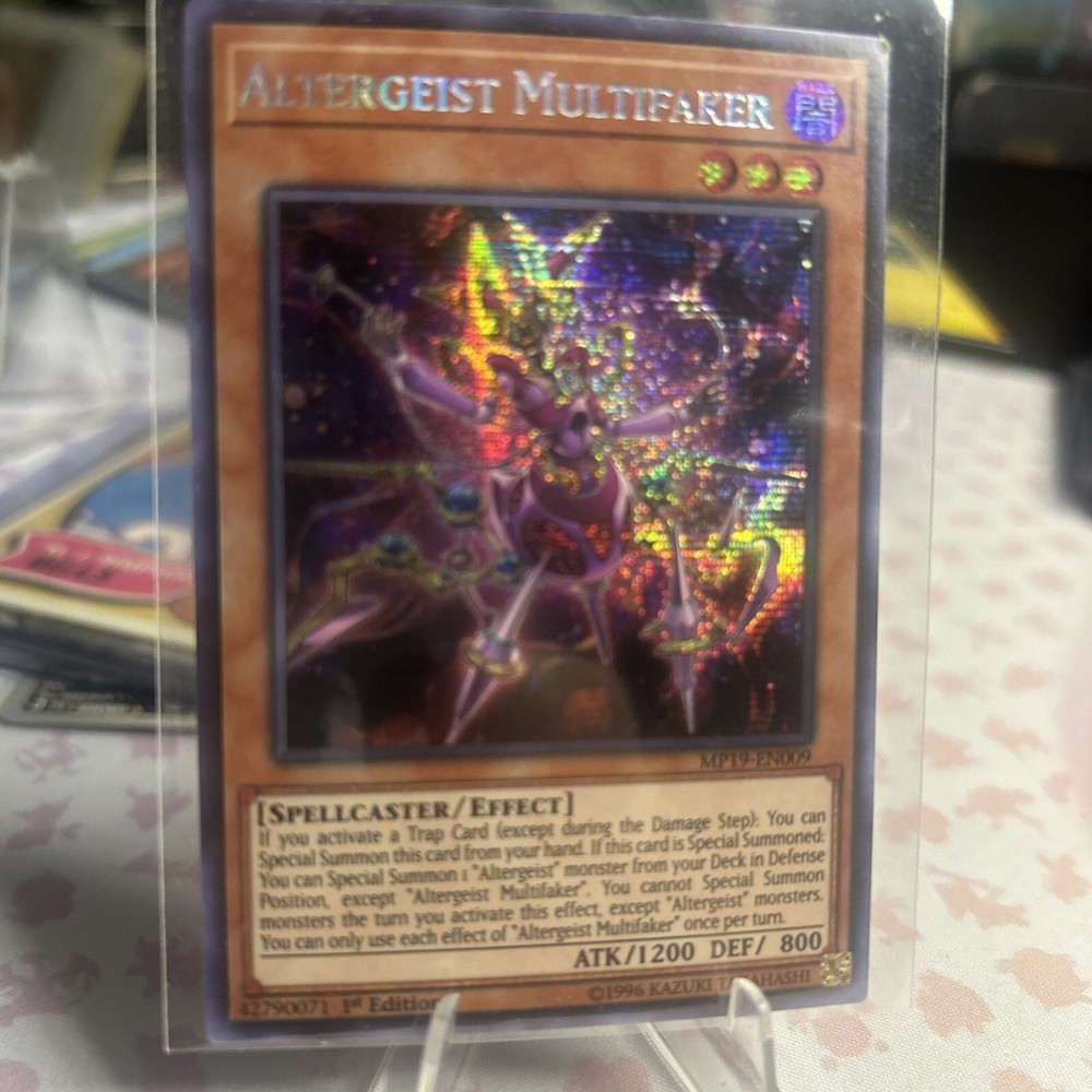 This rare and highly sought-after Yu-Gi-Oh! TCG card features the powerful Altergeist Multifaker, with 1200 attack and 800 defense/toughness. It is a 1st edition, Prismatic Secret Rare card from the 2019 Gold Sarcophagus Tin Mega Pack set. The card is of the Effect type, with the Card Number MP19-EN009. It is perfect for collectors and players of the Yu-Gi-Oh! TCG game. Don't miss out on the opportunity to add this amazing card to your collection! Light wear on top corners