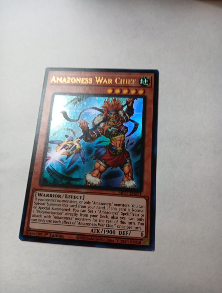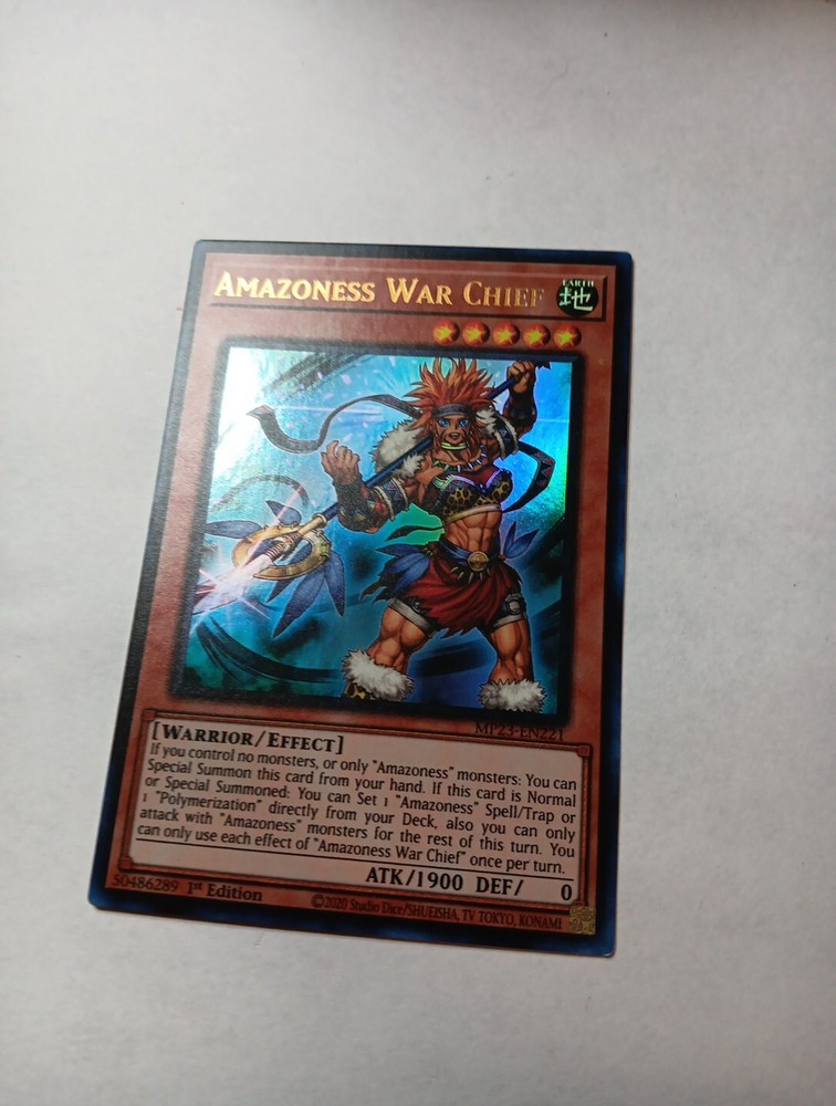 This Yu-Gi-Oh! TCG card is a must-have for any collector. The Amazoness War Chief, with its Ultra Rare rarity and 1st Edition feature, is a powerful addition to any deck. Its Earth attribute and Warrior creature type make it a formidable opponent in battles. The card's Attack/Power of 1900 and Effect card type make it a versatile card that can be utilized in various ways. Its card number is MP23-EN221 and it belongs to the 25th Anniversary Tin: Dueling Heroes Mega Pack set. Don't miss out on the opportunity to add this card to your collection.
