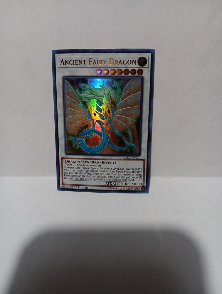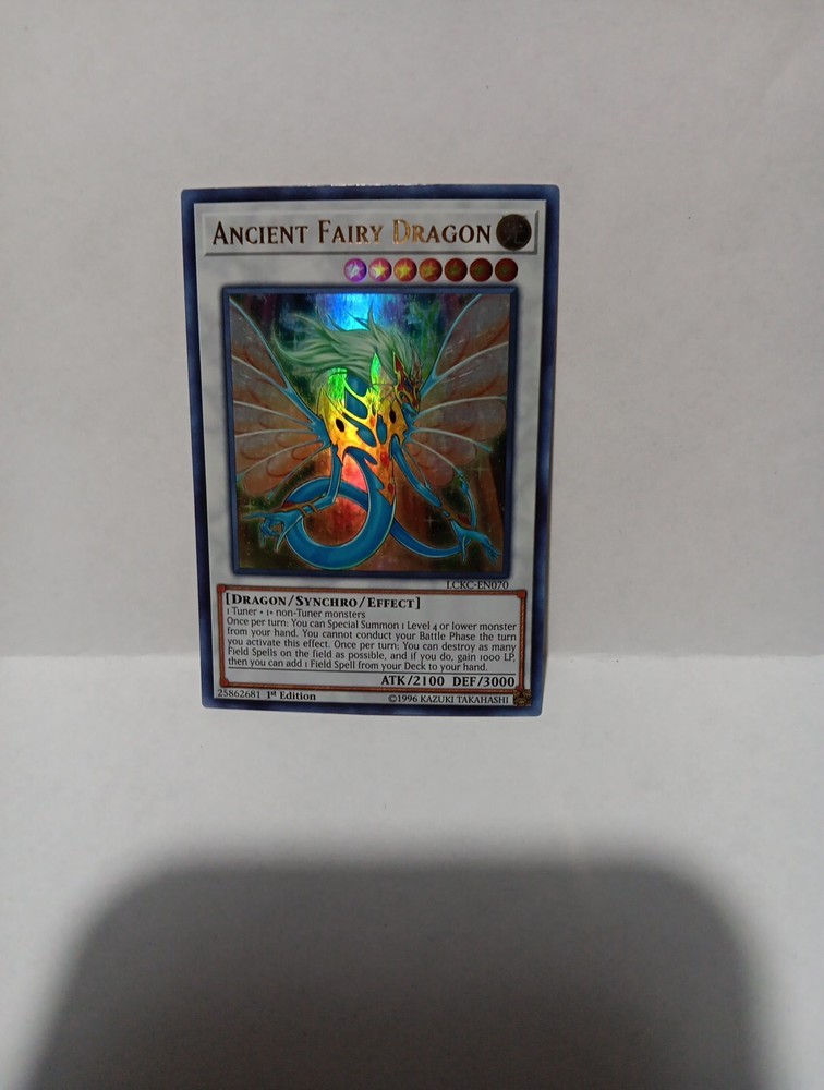 This Yu-Gi-Oh! TCG card from the Legendary Collection Kaiba set is a highly sought-after Ultra Rare card. Its Attack/Power attribute measures 2100 while its Defense/Toughness attribute is at 3000. The card's name is Ancient Fairy Dragon and it is a 1st Edition card with card number LCKC-EN070. The card's condition is near mint or better and it has not been graded. Its features make it a valuable addition to any Yu-Gi-Oh! card collection.