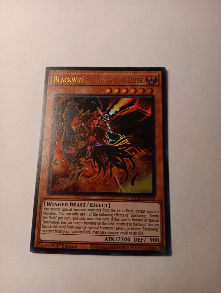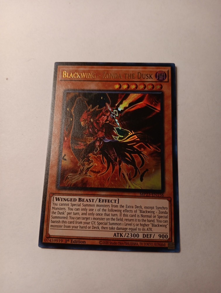 This Yu-Gi-Oh! TCG card is a must-have for any collector or player. With its ultra-rare status and 1st edition feature, the Blackwing-Zonda the Dusk card is a valuable addition to any collection. The card belongs to the Winged creature type, with a beast card type and a defense/toughness of 900. It has an attack/power of 2300 and belongs to the 25th Anniversary Tin: Dueling Heroes Mega Pack set. The card number is MP23-EN156 and it is a beast card type. The card is colored dark and is perfect for players and collectors who are looking for a unique and rare item. It is a great addition to any collection and is sure to impress any Yu-Gi-Oh! fan.